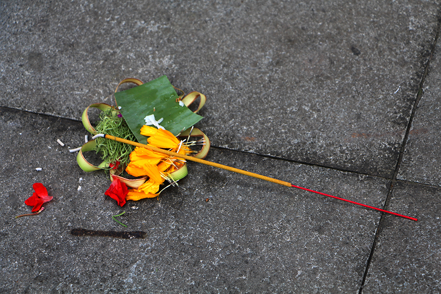 Nous faisons la rencontre de Mama, la propriétaire. Malgré un anglais approximatif, nous comprenons que l'hôtel, comme les trois autres qu'elle possède, est une entreprise familiale et qu'y travaillent tous les fils, neveux, etc. Elle nous parle tout en fabriquant des sortes de petites coupelles en feuilles de bananier avec des fleurs dedans. Nous comprendrons par la suite qu'il s'agit d'offrande et tout le monde en met un peu partout, souvent accompagné d'un bâton d'encens, devant les maisons, les temples, etc. pour se protéger du mauvais œil !
