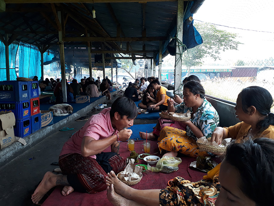 Sur la route du retour, Mama nous emmène ensuite dans un « warung » (restaurant) local. Il s'agit en fait d'un petit espace en bord de route où des gens font et servent à manger, on mange par terre sur des moquettes et franchement c'est super bon et pas cher !!