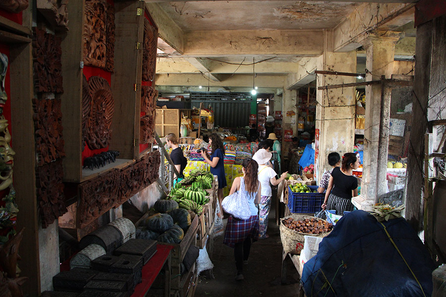 Aujourd'hui, programme chargé ! Nous commençons la journée par un cours de cuisine. Le chauffeur vient nous chercher vers 8h30 à l'hôtel et nous emmène dans un premier temps au marché d'Ubud pour nous montrer où ils achètent les produits que nous allons cuisiner. Nous n'allons pas exactement au même marché qu'hier soir. En fait, hier nous étions en surface, au marché pour les touristes (avec sacs à mains, sarong, et cadeaux souvenirs), mais aujourd'hui nous allons au même endroit mais le guide nous fait descendre dans un marché plus « local » où sont vendus les fruits, les légumes, les épices, etc. où seuls les locaux viennent acheter ! Nous faisons donc le tour des étales et le guide nous explique ce qui va nous servir.