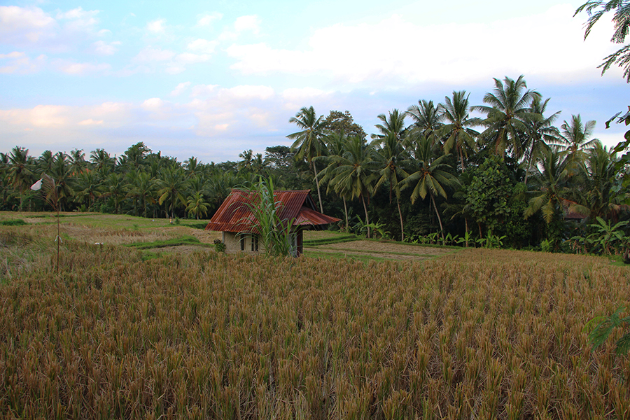Nous nous rendons ensuite dans les rizières d'Ubud. C'est assez incroyable car c'est vraiment collé au centre ville mais on ne le devinerai pas. Depuis la rue principale du marché, un seul tout petit panneau indique le départ du chemin. Après avoir longé quelques toutes petites ruelles, nous débouchons dans de vastes rizières, on ne dirait vraiment pas que nous sommes à deux pas du centre ville surpeuplé d'Ubud ! Nous sommes à la saison sèche et bon nombre de parcelles ont déjà été récolté. Une fois le riz récolté, ils mettent le feu aux parcelles puis les innondent, donc nous n'aurons pas la chance de voir toutes les parcelles de ce vert éclatant typique des rizières, mais ce n'est pas grave, c'est beau quand même! Nous faisons donc la petite boucle d'environ une heure et nous sommes conquis, c'est pour l'instant notre endroit préféré d'Ubud, loin du bruit, des gens et du harcèlement des vendeurs de rue !