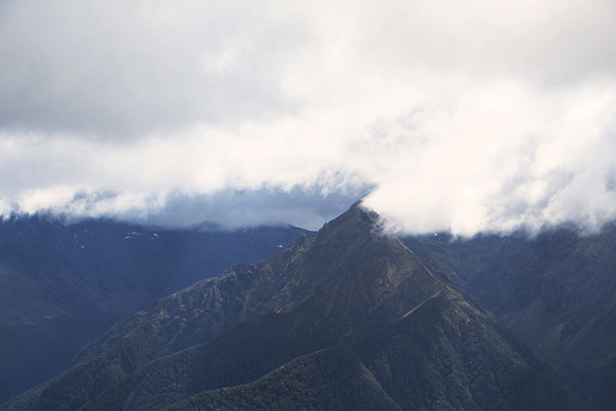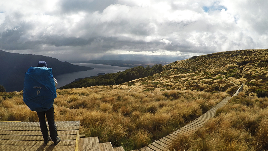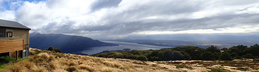 Nous sortons ensuite de la forêt pour une belle vue dégagée et un magnifique arc-en-ciel. Nous continuons jusqu'à la Luxmore Hut pour un petit goûter.