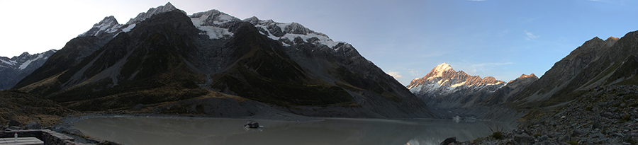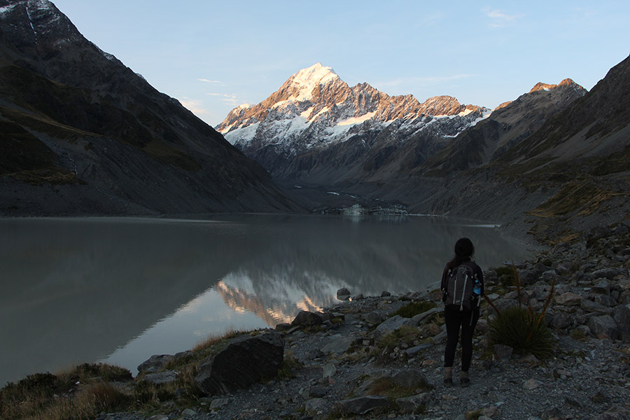 Nous nous rejoignons ensuite au van pour manger. Nous passons l'après-midi à nous reposer et nous avons la visite de Yolaine & Jules qui ont également passé la nuit sur le camp et on fait le mont Olivier ce matin aussi ! C'est un réel plaisir de les revoir, et une bonne occasion de prendre l'apéro ensemble :) Ils repartent ensuite pour Wanaka et nous préparons les sacs car nous souhaitons camper sur la Hooker Valley Track. Il s'agit de la randonnée la plus populaire de la région et dans la journée c'est vraiment DisneyLand avec les cars de touristes qui arrivent en masse...donc nous espérons qu'au crépuscule, elle sera moins fréquentée ! Et nous n'avions pas tord, il ne reste pas grand monde sur la track et la plupart prennent le chemin du retour. Le chemin est tout plat et mène au plus près du mont Cook et il faut bien se l'avouer c'est splendide, les lumières du crépuscule ajoute un charme particulier magnifique !