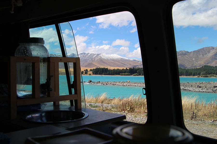 Nous avions prévu de filer à Timaru sur la côte est aujourd'hui pour entamer notre remonter vers le nord. Mais c'est tellement beau que nous décidons de rester une nuit pour tenter de faire du canoë sur le lac demain car le temps est annoncé plus clément. Nous nous baladons donc autour du lac pour tenter de trouver un accotement pour dormir car nous avons le droit avec notre van. Les abords sont superbes !