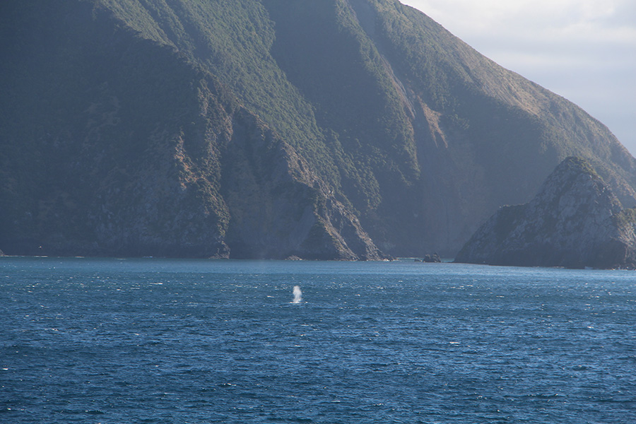 Pour repartir le ferry longe les fjords des Malborough Sounds, on monte donc sur le pont le plus haut pour profiter de la superbe vue ! Quand soudain on aperçoit le jet d'une baleine ! On essaye de la prendre en photo mais ça ne rend pas grand chose avec notre appareil ;)