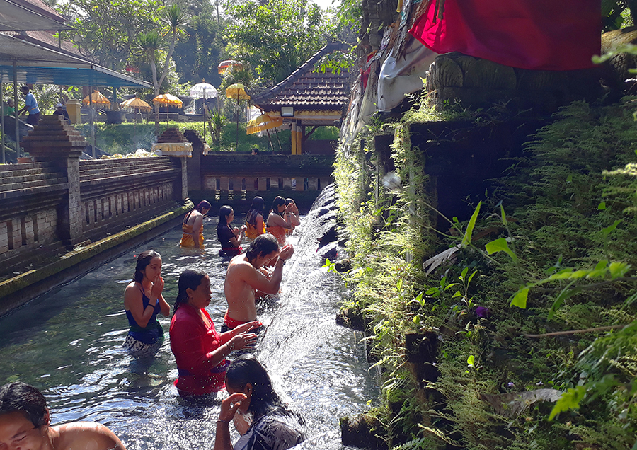 Nous arrivons ensuite à la fontaine. Il 'agit d'une fontaine sacrée et il y a toute un protocole pour s'y purifier ! Nous entrons par un côté et devons faire le même protocole devant chaque fontaine, chacune correspondant à une divinité. Tout d'abord il faut se tenir debout devant le jet d'eau, le mains jointes en guise de prière, puis boire trois gorgées d'eau de la fontaine, pour enfin se rincer sous le jet d'eau ! Nous faisons donc la queue car chacun fait le même exercice sur toutes les fontaines. Étonnamment, l'eau est plutôt fraîche, ça réveille :)