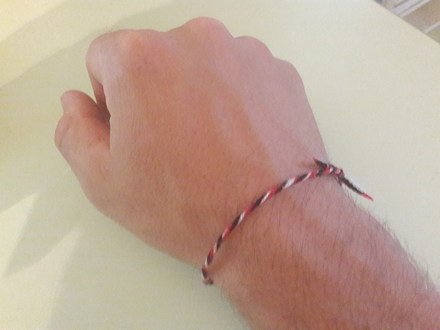 Ensuite, nous nous rendons au petit temple où un homme nous jette de l'eau et du riz sur la tête à l'aide d'une petite brosse ressemblant à un blaireau de rasage. Il nous place également quelques grains de riz sur le front et le haut du torse et nous attache un bracelet tressé au poignet de chacun. Nous voilà donc purifiés :)