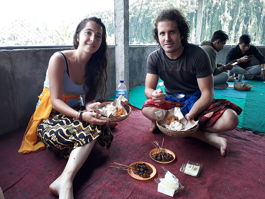 Sur la route du retour, Mama nous emmène ensuite dans un « warung » (restaurant) local. Il s'agit en fait d'un petit espace en bord de route où des gens font et servent à manger, on mange par terre sur des moquettes et franchement c'est super bon et pas cher !!