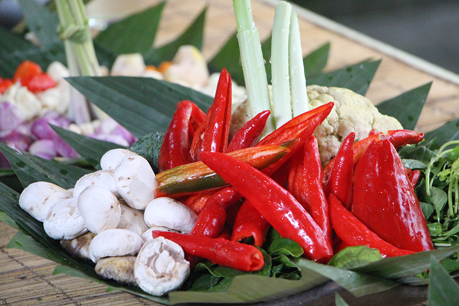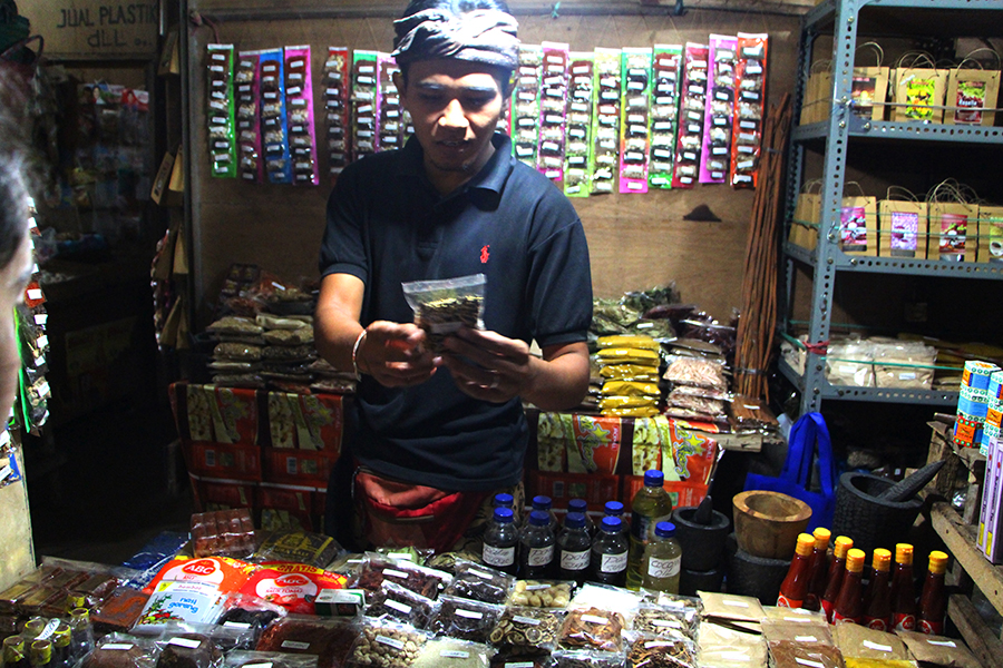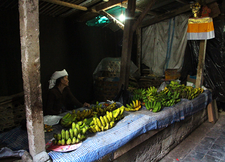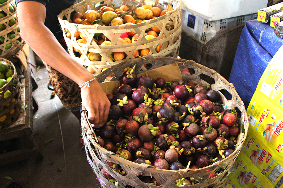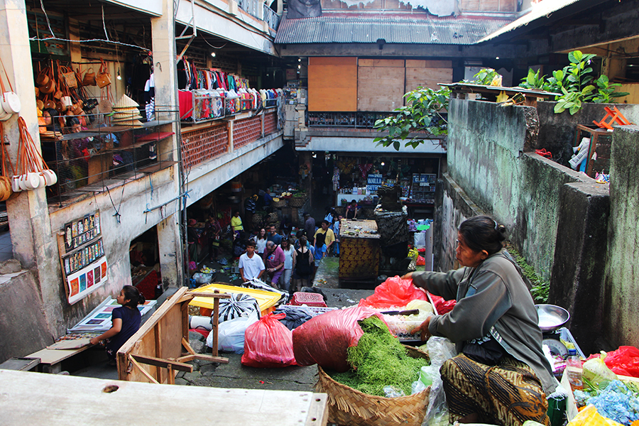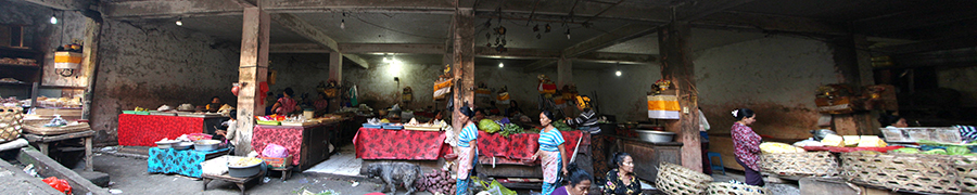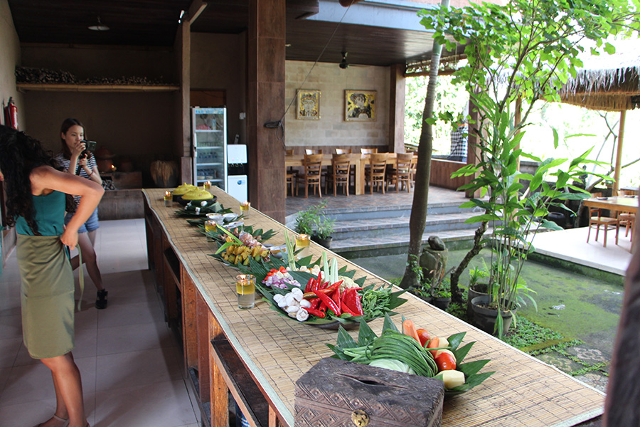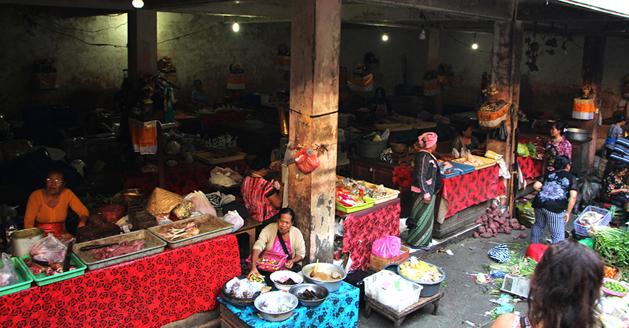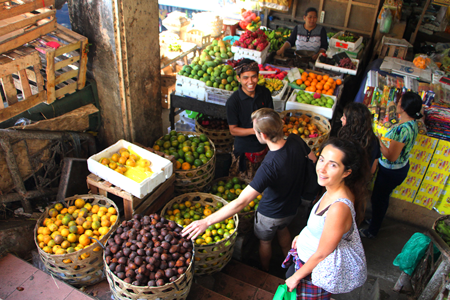 Aujourd'hui, programme chargé ! Nous commençons la journée par un cours de cuisine. Le chauffeur vient nous chercher vers 8h30 à l'hôtel et nous emmène dans un premier temps au marché d'Ubud pour nous montrer où ils achètent les produits que nous allons cuisiner. Nous n'allons pas exactement au même marché qu'hier soir. En fait, hier nous étions en surface, au marché pour les touristes (avec sacs à mains, sarong, et cadeaux souvenirs), mais aujourd'hui nous allons au même endroit mais le guide nous fait descendre dans un marché plus « local » où sont vendus les fruits, les légumes, les épices, etc. où seuls les locaux viennent acheter ! Nous faisons donc le tour des étales et le guide nous explique ce qui va nous servir.