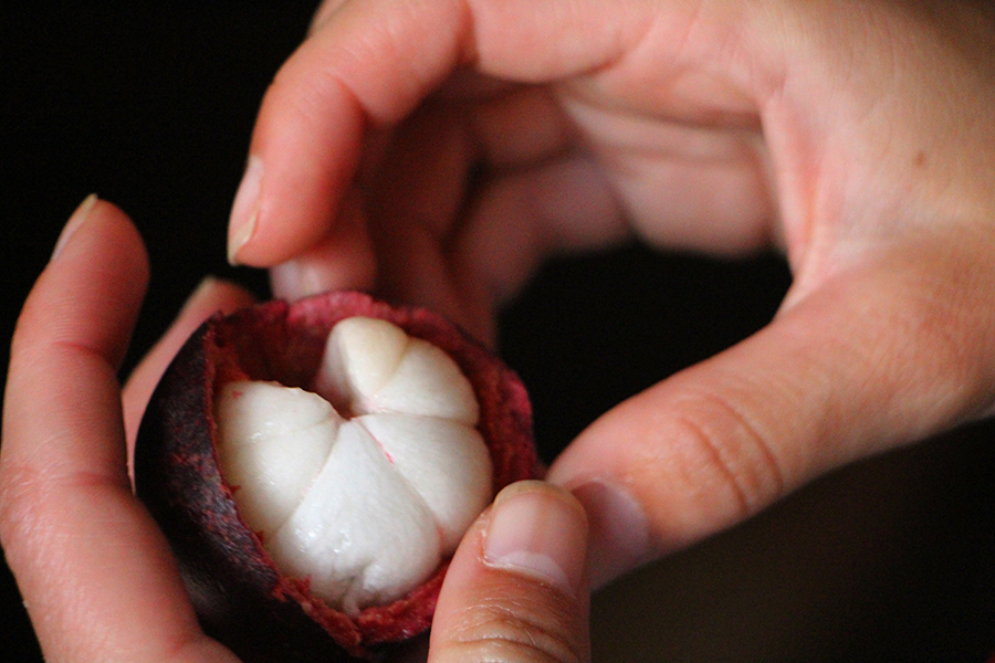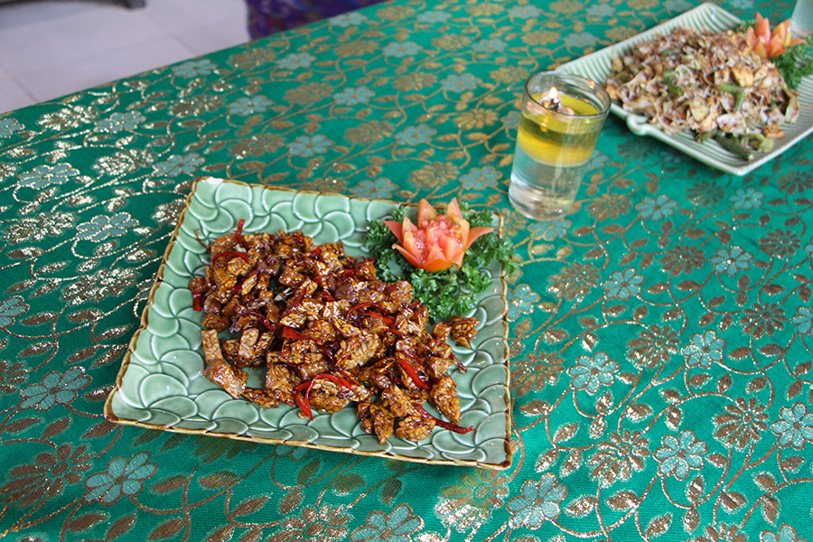 Nous faisons la rencontre de Mama, la propriétaire. Malgré un anglais approximatif, nous comprenons que l'hôtel, comme les trois autres qu'elle possède, est une entreprise familiale et qu'y travaillent tous les fils, neveux, etc. Elle nous parle tout en fabriquant des sortes de petites coupelles en feuilles de bananier avec des fleurs dedans. Nous comprendrons par la suite qu'il s'agit d'offrande et tout le monde en met un peu partout, souvent accompagné d'un bâton d'encens, devant les maisons, les temples, etc. pour se protéger du mauvais œil !