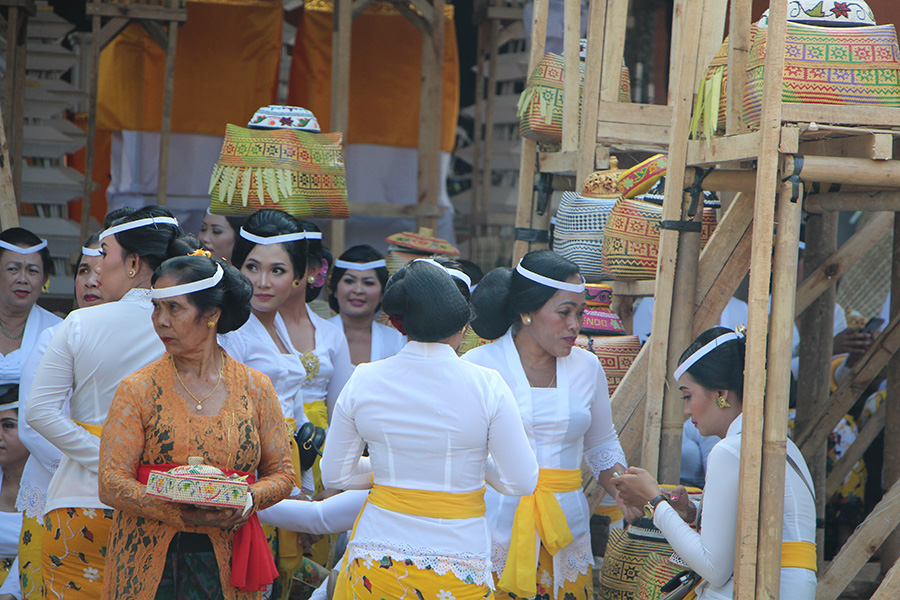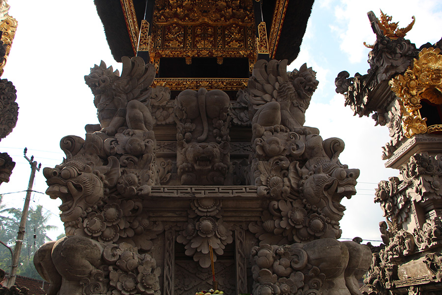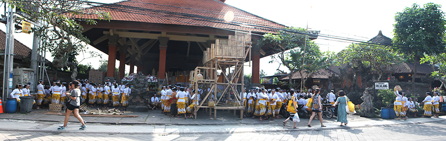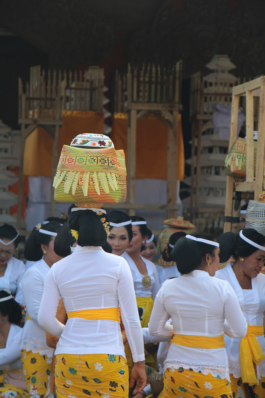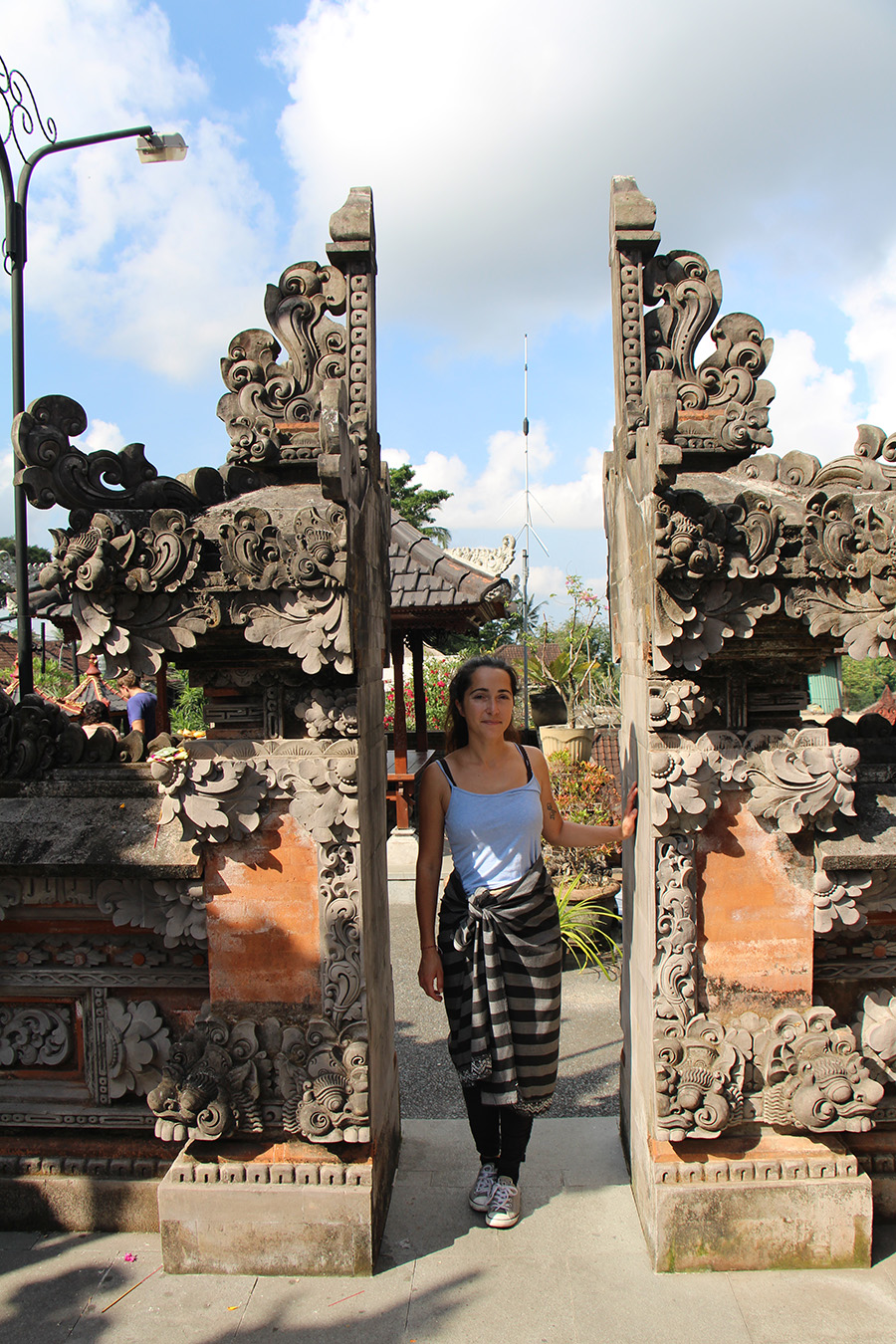 A 13h donc nous partons avec Mama et deux autres dames, accompagnés par Kadek, l'un des neveu qui fait le chauffeur. Juste avant de partir, elle nous habille d'un sarong, étoffe très joliment décorée que tout le monde porte ici et qui doit être portée dans les endroits sacrés.
