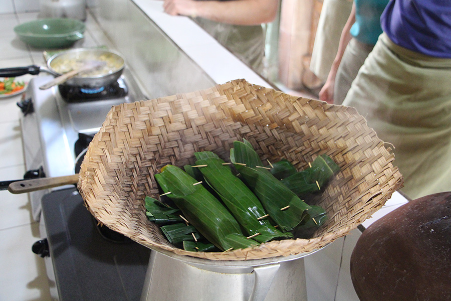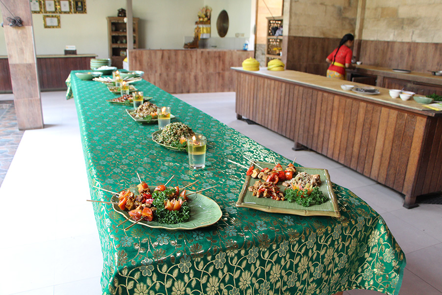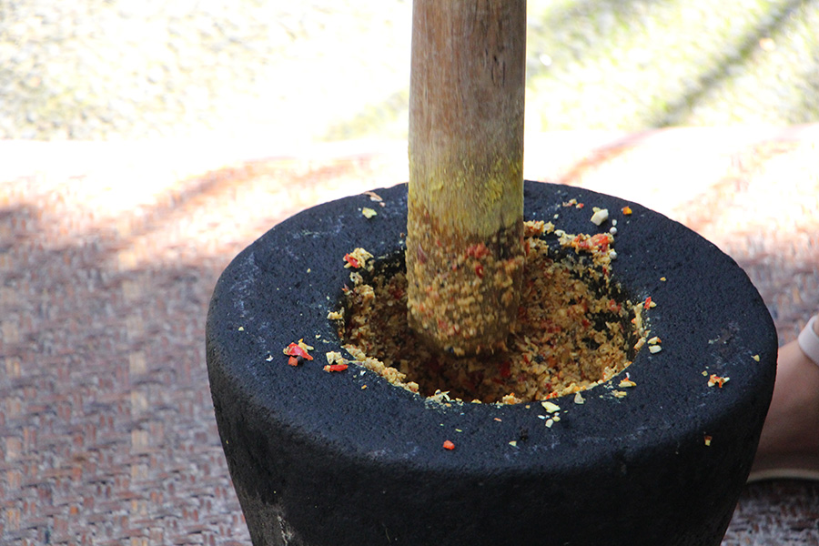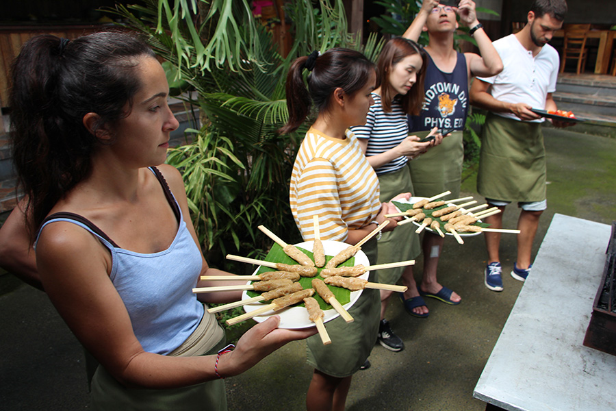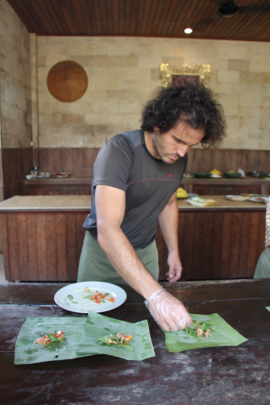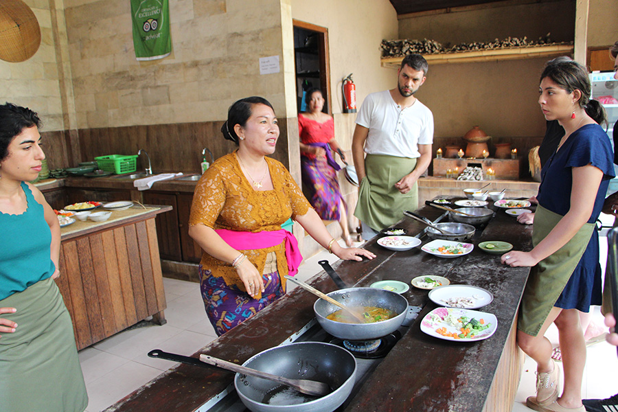 Nous rejoignons ensuite la dizaine de personnes qui vont nous accompagner pour le cours de cuisine. Il y a un peu de tout, des australiens évidemment, des chinois, des français mais aussi des hollandais, car oui nous l'apprenons mais l'Indonésie est une ancienne colonie hollandaise ! Et c'est donc parti pour une matinée de cuisine ! Et il faut dire que c'est super bien organisé, nous n'avons que les choses sympas à faire, des petites mains s'occupent de faire la vaisselle, le nettoyage, etc. Et nous cuisinons vraiment plein de plats différents, heureusement qu'ils nous donnent un livret avec toutes les recettes à la fin car sinon il serait vraiment dur de se rappeler de tout ^^ Nous découvrons même les technique de mortier à l'ancienne ! Nous finissons par un bon repas avec ce que nous avons cuisiné et il faut l'admettre, c'est trop bon ^^