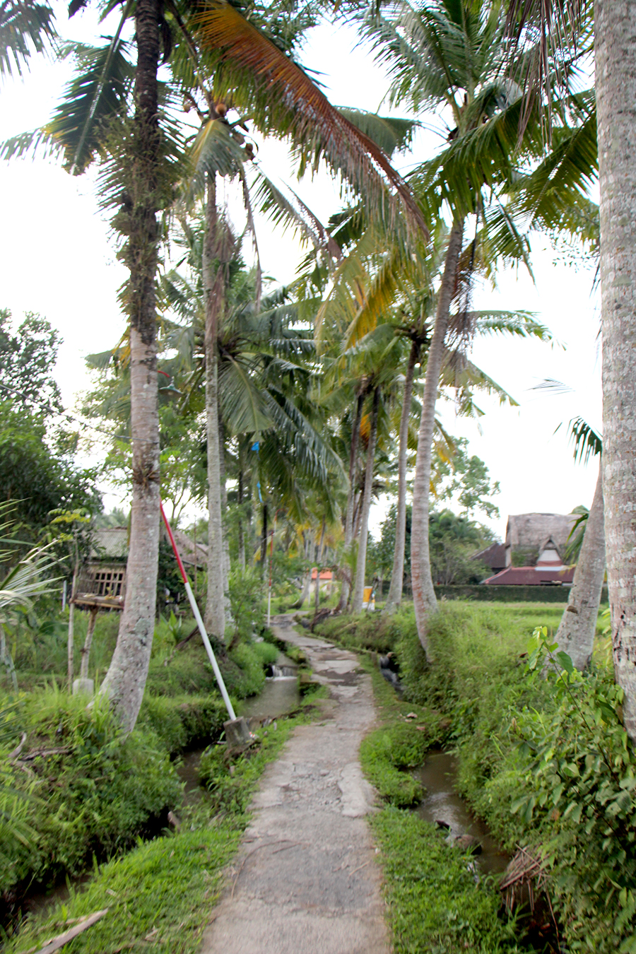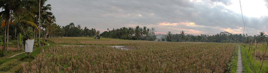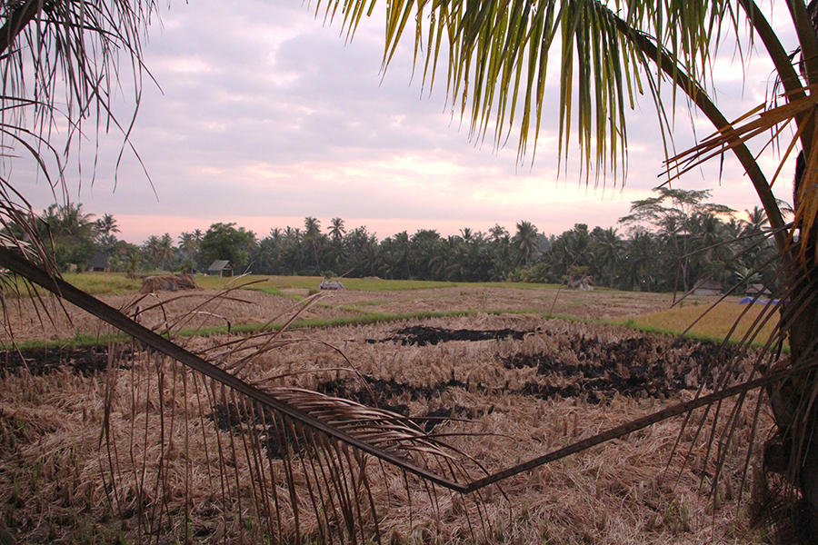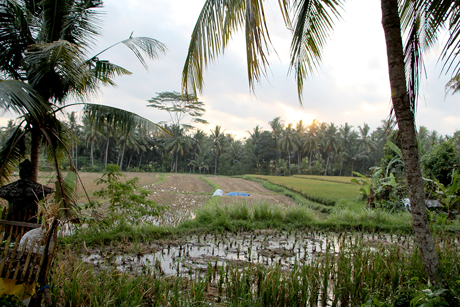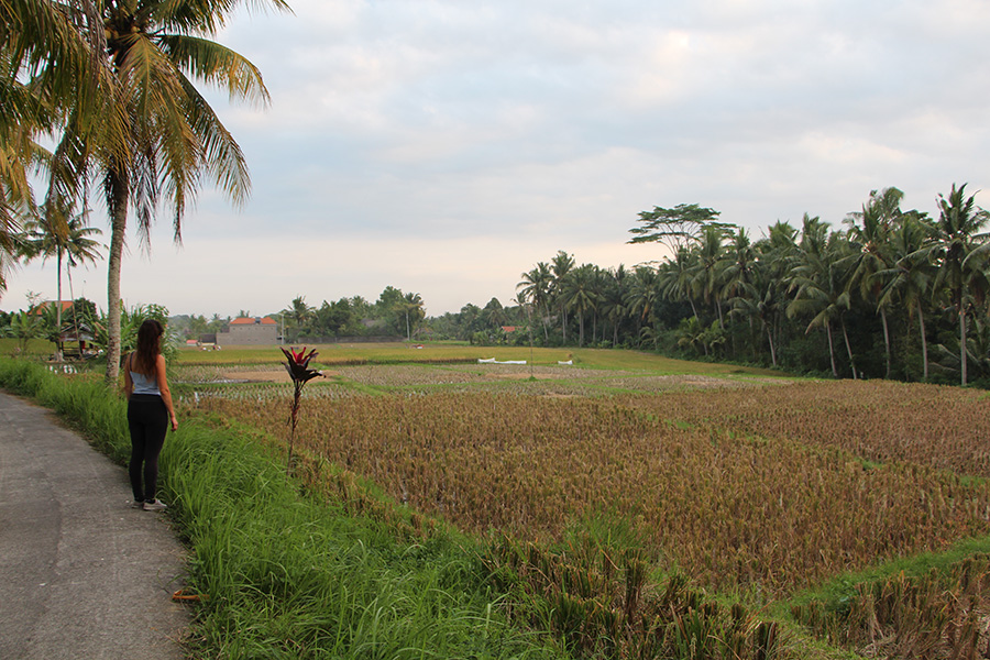 Nous nous rendons ensuite dans les rizières d'Ubud. C'est assez incroyable car c'est vraiment collé au centre ville mais on ne le devinerai pas. Depuis la rue principale du marché, un seul tout petit panneau indique le départ du chemin. Après avoir longé quelques toutes petites ruelles, nous débouchons dans de vastes rizières, on ne dirait vraiment pas que nous sommes à deux pas du centre ville surpeuplé d'Ubud ! Nous sommes à la saison sèche et bon nombre de parcelles ont déjà été récolté. Une fois le riz récolté, ils mettent le feu aux parcelles puis les innondent, donc nous n'aurons pas la chance de voir toutes les parcelles de ce vert éclatant typique des rizières, mais ce n'est pas grave, c'est beau quand même! Nous faisons donc la petite boucle d'environ une heure et nous sommes conquis, c'est pour l'instant notre endroit préféré d'Ubud, loin du bruit, des gens et du harcèlement des vendeurs de rue !