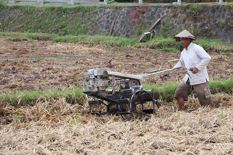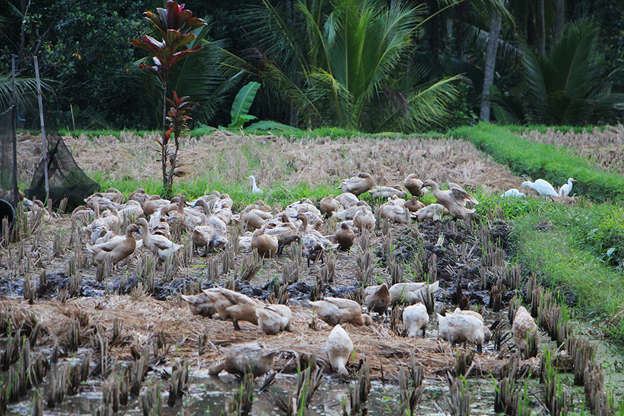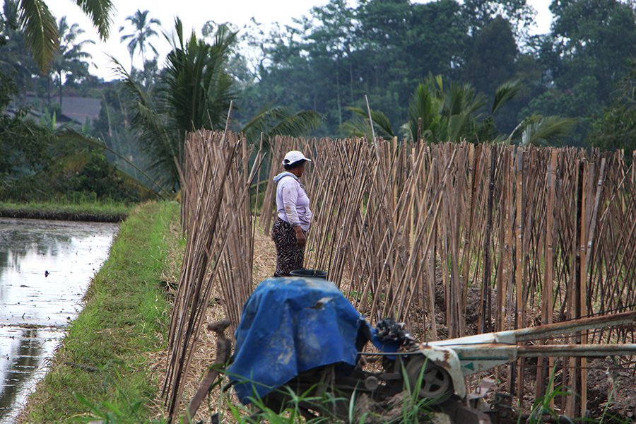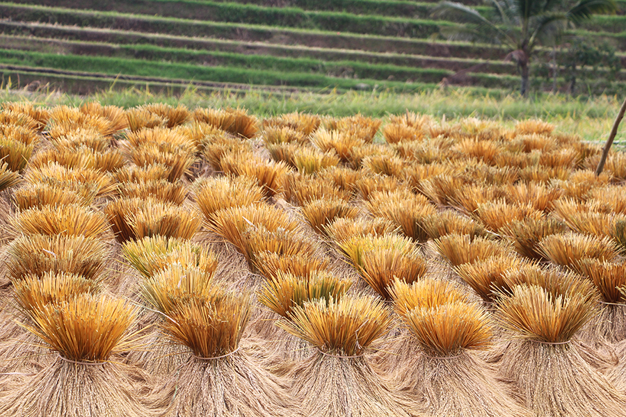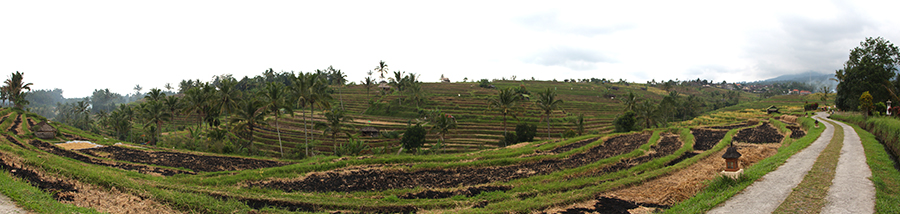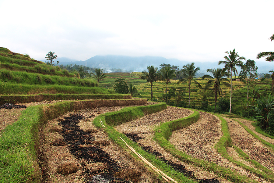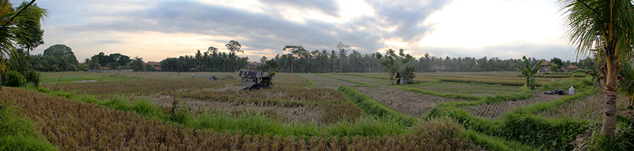 Nous nous rendons ensuite dans les rizières d'Ubud. C'est assez incroyable car c'est vraiment collé au centre ville mais on ne le devinerai pas. Depuis la rue principale du marché, un seul tout petit panneau indique le départ du chemin. Après avoir longé quelques toutes petites ruelles, nous débouchons dans de vastes rizières, on ne dirait vraiment pas que nous sommes à deux pas du centre ville surpeuplé d'Ubud ! Nous sommes à la saison sèche et bon nombre de parcelles ont déjà été récolté. Une fois le riz récolté, ils mettent le feu aux parcelles puis les innondent, donc nous n'aurons pas la chance de voir toutes les parcelles de ce vert éclatant typique des rizières, mais ce n'est pas grave, c'est beau quand même! Nous faisons donc la petite boucle d'environ une heure et nous sommes conquis, c'est pour l'instant notre endroit préféré d'Ubud, loin du bruit, des gens et du harcèlement des vendeurs de rue !