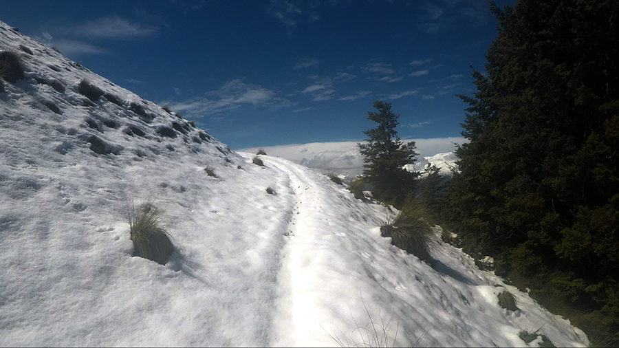 Arrivés sur place, nous nous garons et Aurélie sent bien que Thibault a une envie irrépressible d'aller tâter la neige sous le soleil ! Elle le laisse donc partir en trail pour atteindre la neige dans les hauteurs avant l'arrivée du mauvais temps. Parce que pour l'instant pas de signe de mauvais temps mais on ne se fera plus avoir ^^ C'est donc parti pour le sommet de Big Hill pour Thibault, le chemin se couvre petit à petit de neige pour en avoir aux genoux au sommet. En plus du dénivelé, ça pique un peu mais la vue en haut vaut tous les efforts ^^ C'est sublime !!