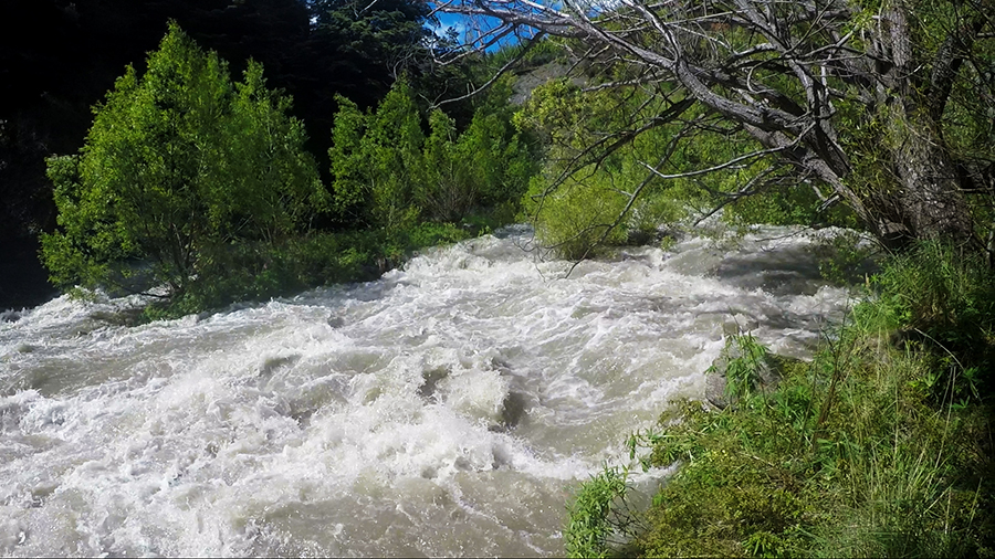 Aujourd'hui nous allons chercher de l'or dans la Arrow River, connue pour être abondante en métal précieux :) Il fait beau et ça fait du bien ! Par contre la rivière est en crue suite aux pluies des jours précédents ce qui n'arrangent en rien nos affaires pour trouver de l'or...Pas grave on passe la journée à remonter la rivière en s'arrêtant à certains endroits que nous pensons plus ou moins stratégiques pour faire des recherches. Résultat : pas grand chose, deux petites paillettes pour une journée d'efforts, c'est pas chère payé...On positive en profitant du beau temps et de la vue sur les sommets enneigés alentours ^^