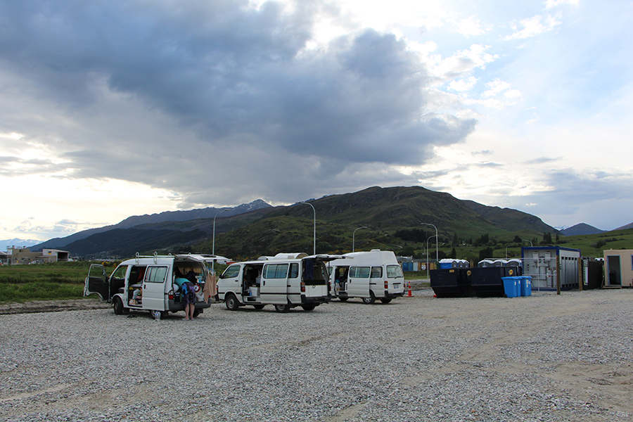 Nous rentrons au van bredouilles et bien fatigués mais avec le sourire :) Nous passons au Free Hub prendre une douche et comme on vous en parle souvent, voici une petite photo du Free Hub de Queenstown, qui se résume en fait à un parking de gravier sur lequel sont mis à disposition toilettes, douches chaudes et wifi pour une heure. Le bon point supplémentaire est que le parking est situé aux pieds des Remarkables, ces montagnes magnifiques situées en face de Queenstown, et la vue est pas mal :)
