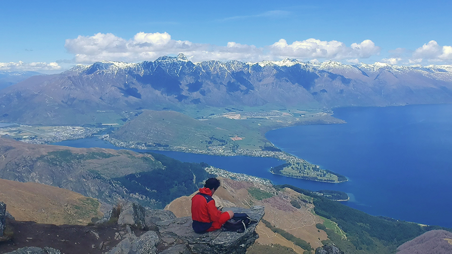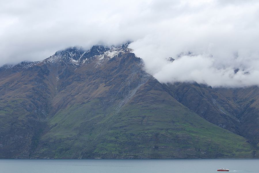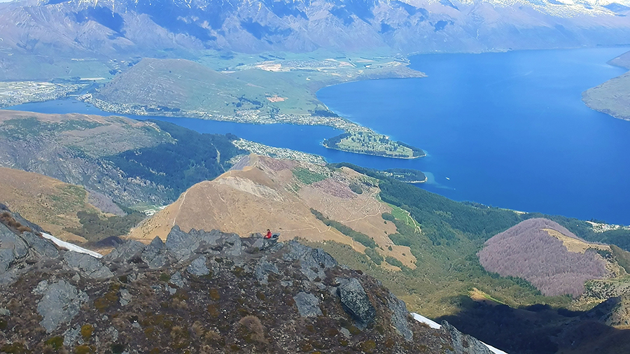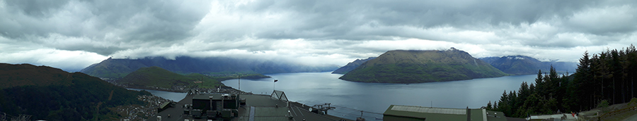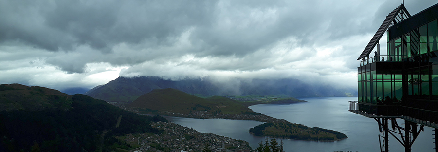 Une petite heure de marche plus tard, nous voilà au point de vue. L'endroit ressemble à un parc d'attraction avec restaurant, boutique souvenirs, piste de luge à roulette, et bien sûr horde de touristes ! Malgré tout ça et le mauvais temps, la vue reste belle sur Queenstown et le lac.