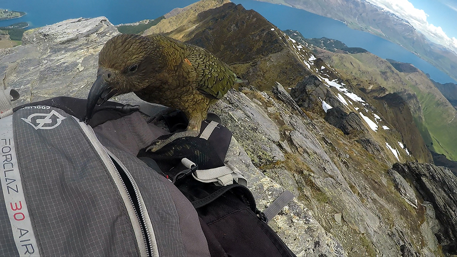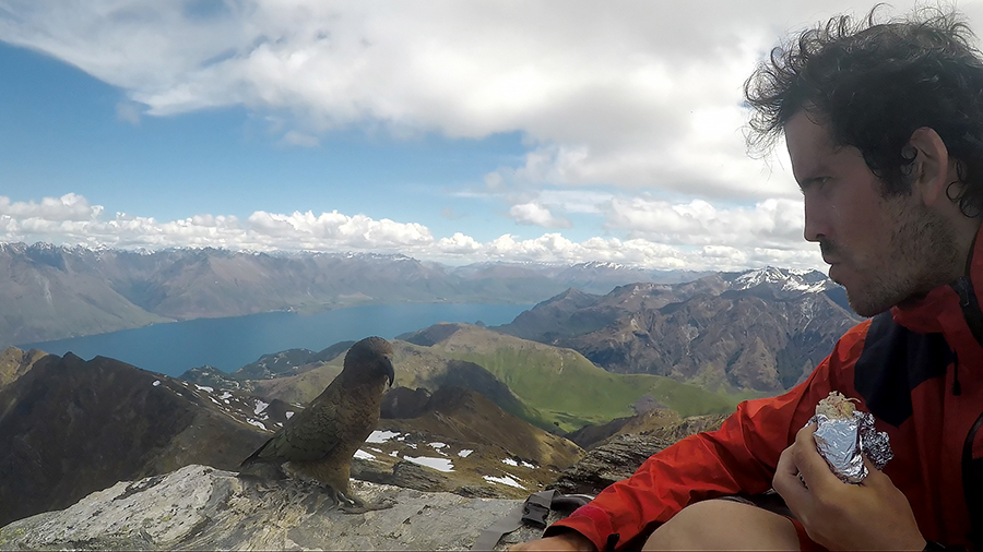 De plus, un superbe oiseau, sûrement bien habitué aux touristes qui doivent le nourrir (c'est pas bien), vient tenir compagnie à Thibault au sommet pendant le pique-nique. Il n'est vraiment pas sauvage et s’approche extrêmement prêt jusqu’à venir donner des coups de bec sur le sac à dos situé aux pieds de Thibault !