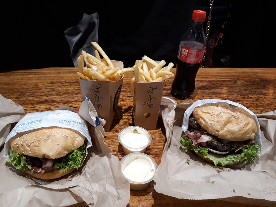Nous nous récompensons en allant en début de soirée manger chez Ferg Burger réputé pour faire les meilleurs burgers de NZ. Depuis que nous sommes à Queenstown, chaque fois que nous sommes passés devant, il y a une queue de plus de 30 minutes, ce qui est pour nous rédhibitoire car aucun burger ne vaut 30minutes de queue debout dans la rue à nos yeux ^^ Mais ce soir là, coup de chance, la queue est toute petite, nous tentons donc notre chance. Cinq minutes pour commander et dix de plus pour être servis : parfait ! Les burgers sont bons certes mais nous avons mangé meilleur à Taupo par contre les frites faites maison sont trop bonnes, miam :) Dans tous les cas, nous sommes d'accords sur le fait que la réputation du lieu est un peu exagérée et la queue continue devant aussi. De plus, c'est une véritable usine, il y a une dizaine de commis de cuisine que nous qualifieront plutôt d'esclaves tant ils travaillent vite et de manière mécanique...c'est impressionnant comme le travail est découpé, nous sommes vraiment face à une chaîne de montage de burgers ! Les commandes sont numérotées et les numéros défilent sur un écran. Nous sommes la commande 27 et après les quinze minutes que nous prenons pour manger l'écran affiche la commande 130...Ce qui remet un peu en perspective l'ambiance conviviale qui devait régner aux débuts de l'aventure Ferg Burger. Aujourd’hui le lieu n'a plus rien de chaleureux et est envahie de touristes chinois qui prennent des selfis avec leurs burgers...tout ça pour dire qu'on est content d'avoir testé mais que si vous passer à Queenstown, ne faites pas 30 minutes de queue pour ça ^^