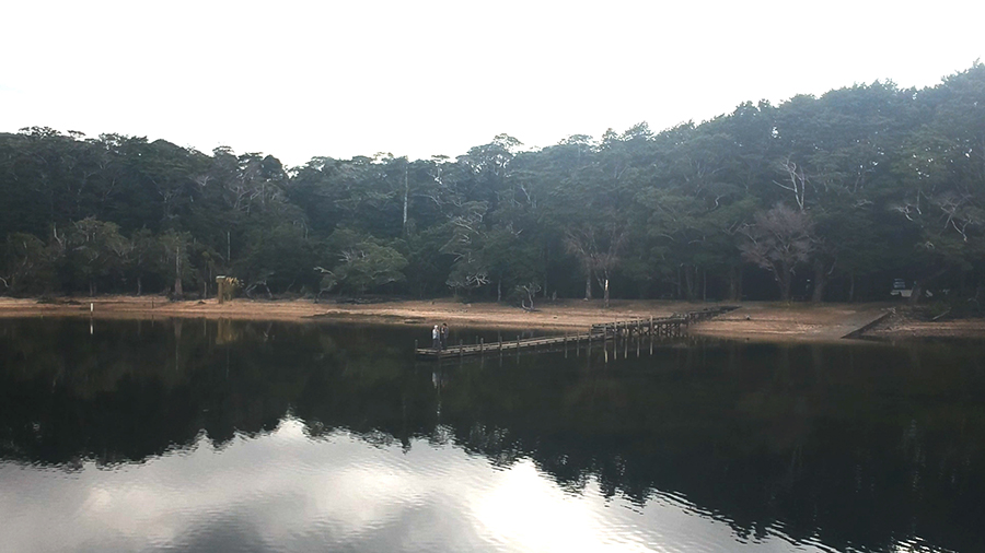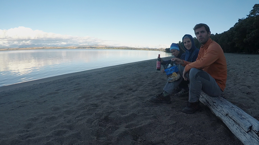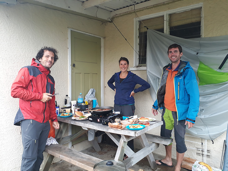 Comme prévu, les 5km dans la forêt se déroulent sans encombre. Nous plantons la tente à Brod Bay avec une super lumière de fin de journée. En plus ça tombe bien, Jean-Yves a planqué la bouteille de rouge dans le sac pour l'apéro ^^