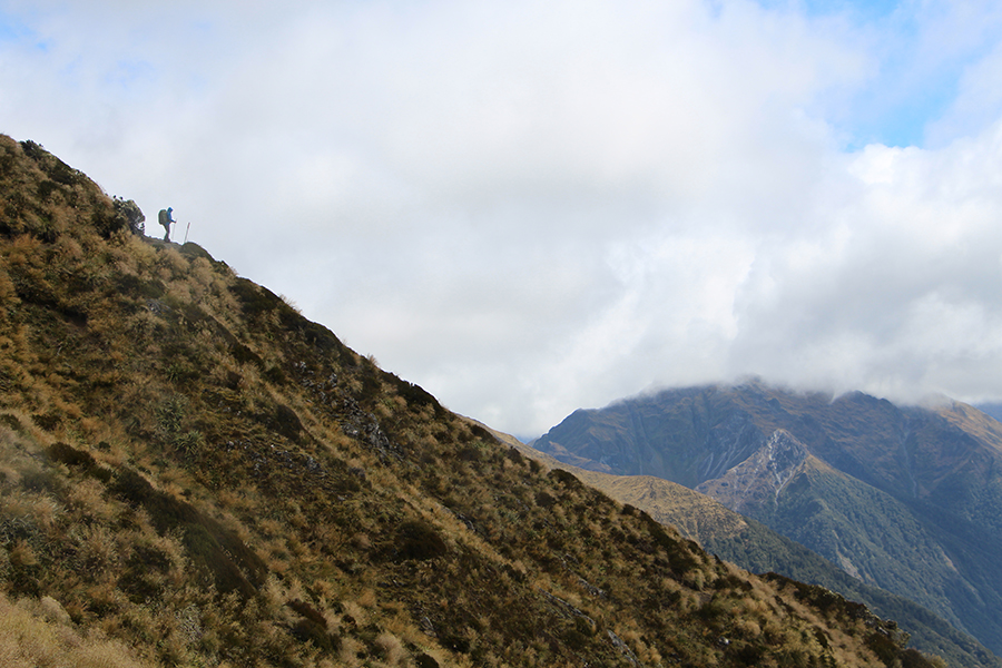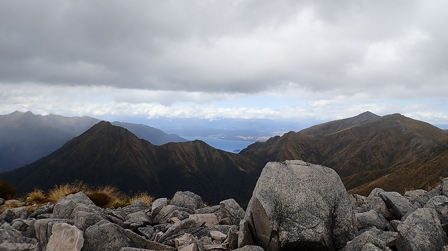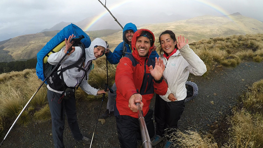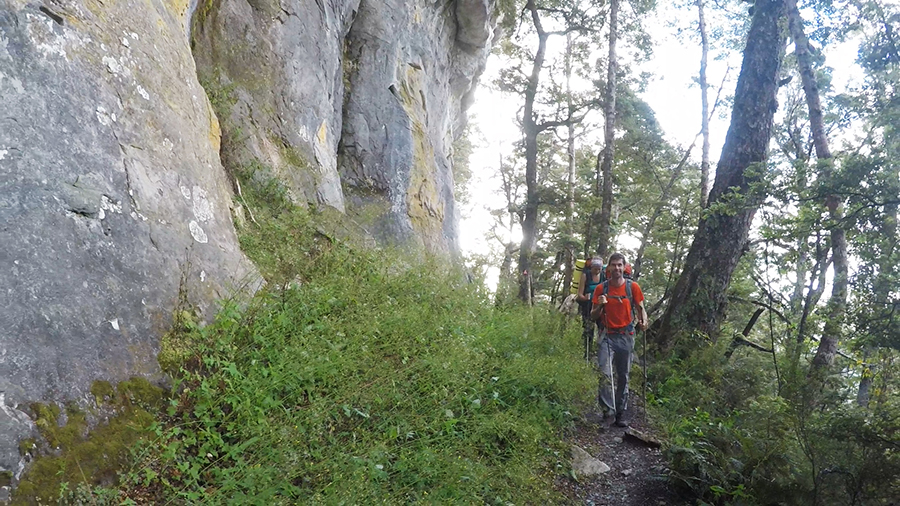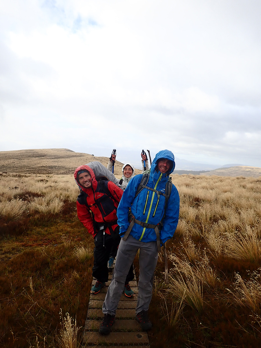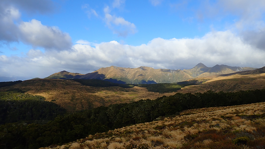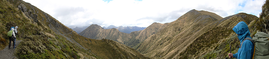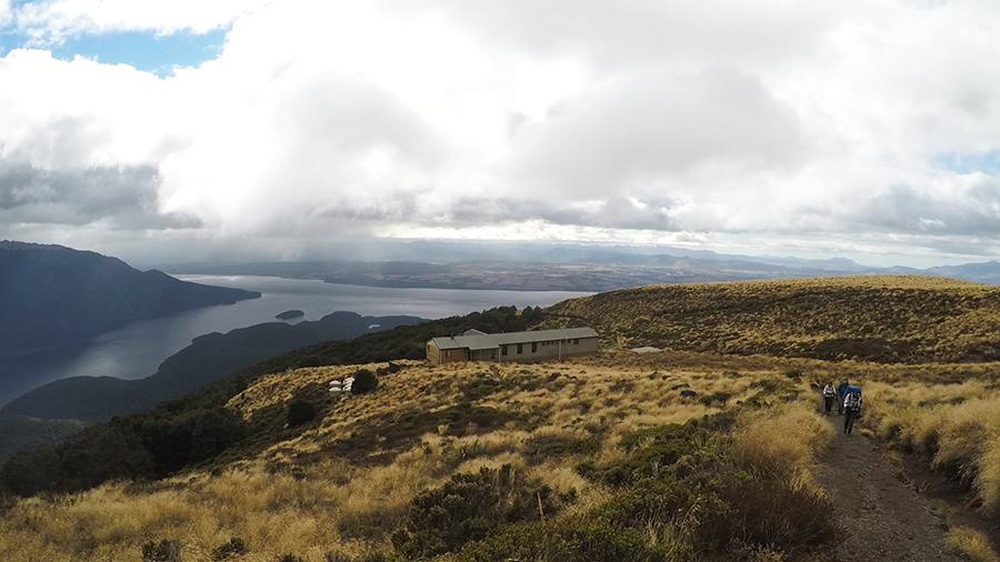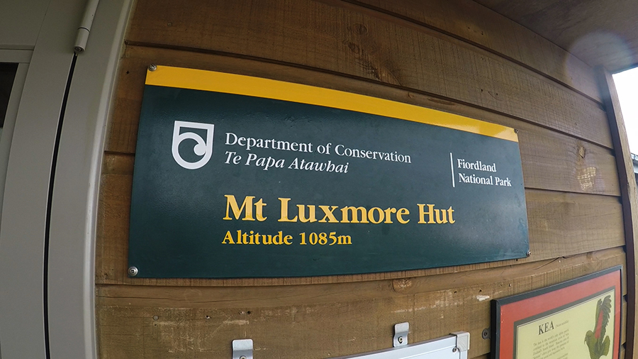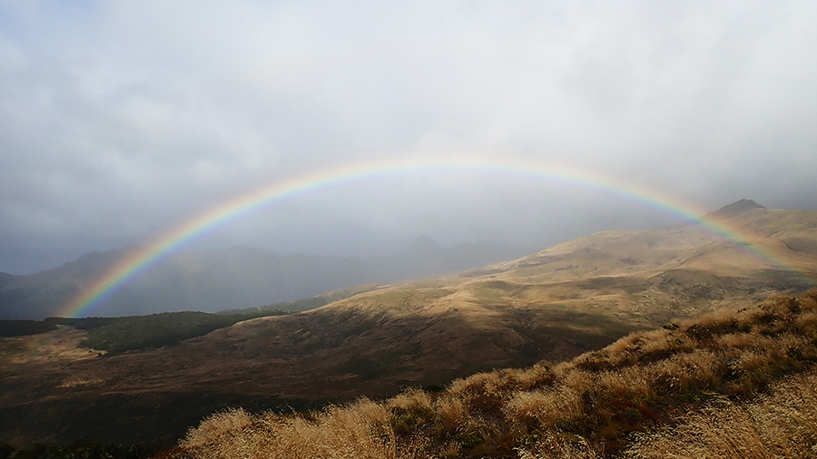 Nous sortons ensuite de la forêt pour une belle vue dégagée et un magnifique arc-en-ciel. Nous continuons jusqu'à la Luxmore Hut pour un petit goûter.