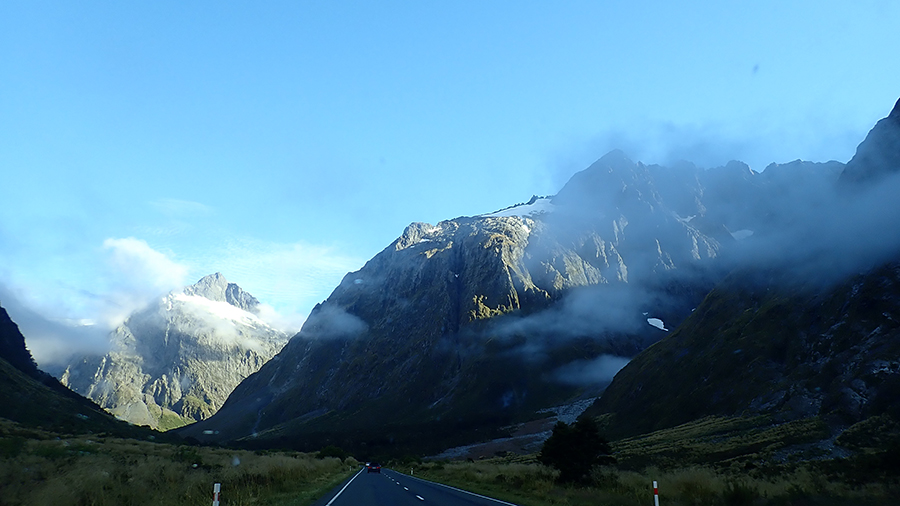 Aujourd'hui, nous devons partir tôt car nous avons réserver un tour en bateau sur le Milford Sound, le fjord emblématique de la région et il y a quand même 1h30 de route ! La route est belle mais compte un tunnel à une seule voie ou nous devons attendre à l'entrée...Nous en profitons pour faire quelques photos.