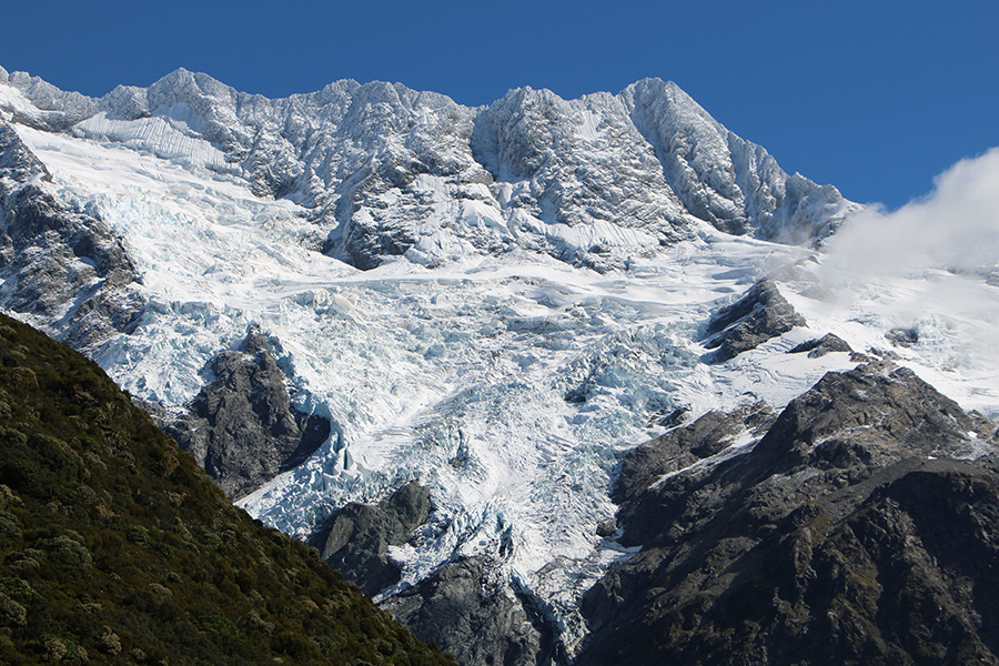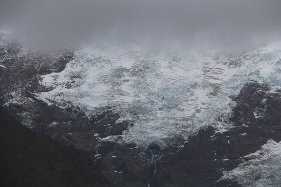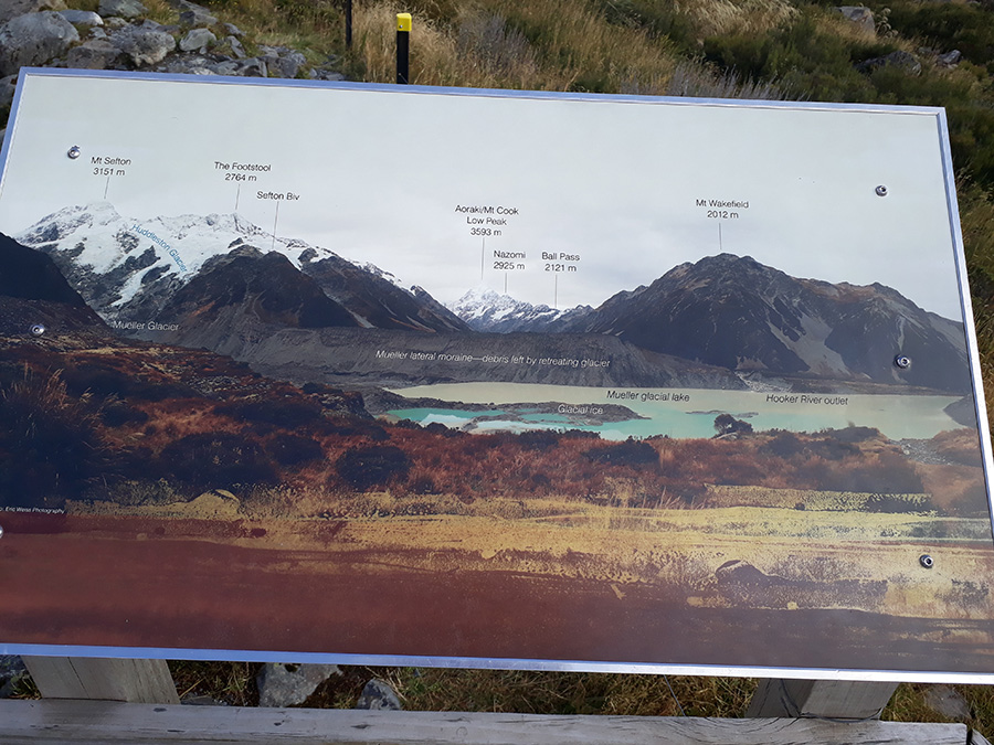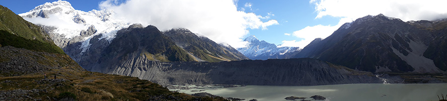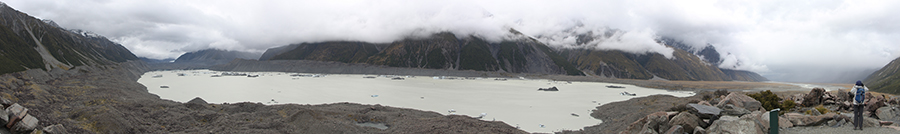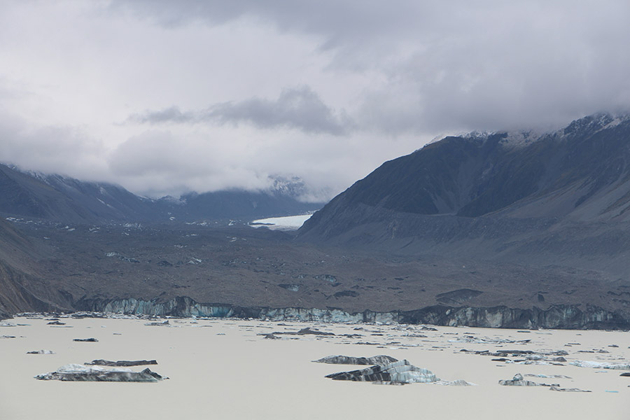 Aujourd'hui, nous nous réveillons sur le freecamp d'Omarama et filons à Mont Cook village puis au départ des randonnées. Comme c'était prévu, le temps est super couvert et on ne voit pas le haut des montagnes, pour voir le Mont Cook, on repassera...nous espérons qu'il neige au sommet pour que les montagnes soient enneigées quand le temps se dégagera demain ! Et puis, nous voyons quand même le glacier descendre sous les nuages et c'est déjà beau :) Il faut avouer que c'est une particularité que l'on a pas en France. Ici en NZ, les vallées sont extrêmement larges et permettent de se rendre aux pieds de montagnes très hautes en toute tranquillité, c'est assez fou (nous avions déjà noté ça dans la vallée du Mont Aspiring vers Wanaka).
