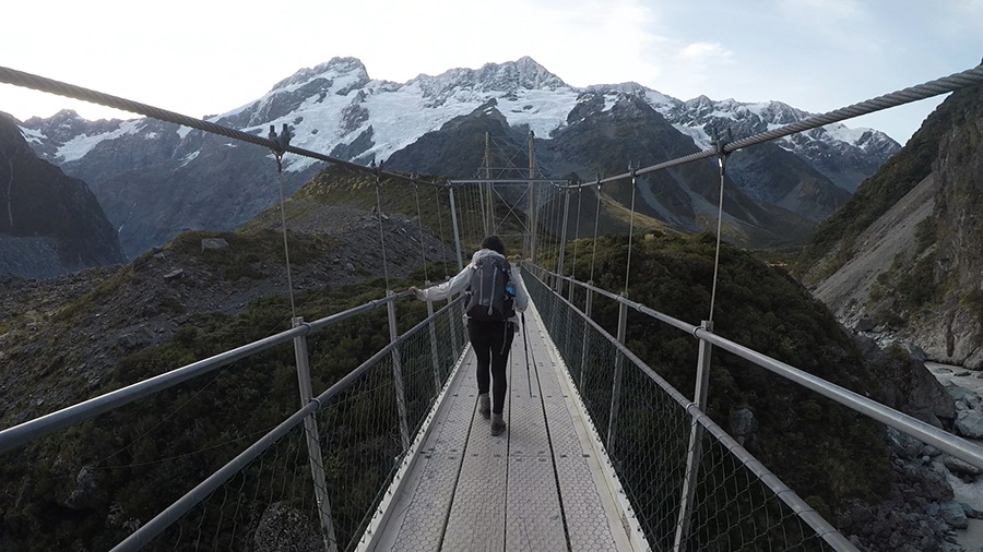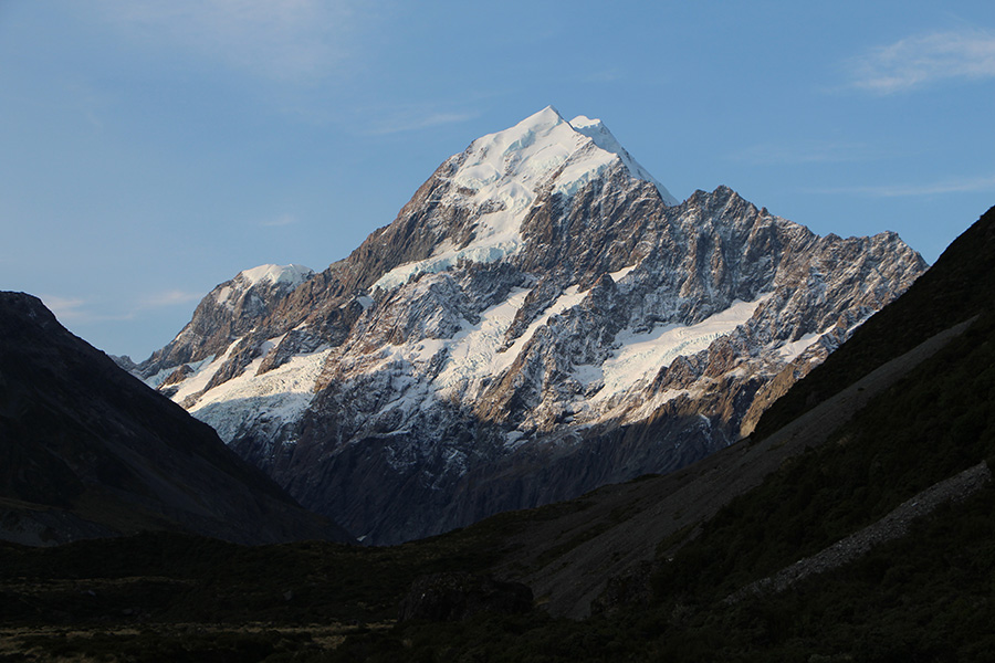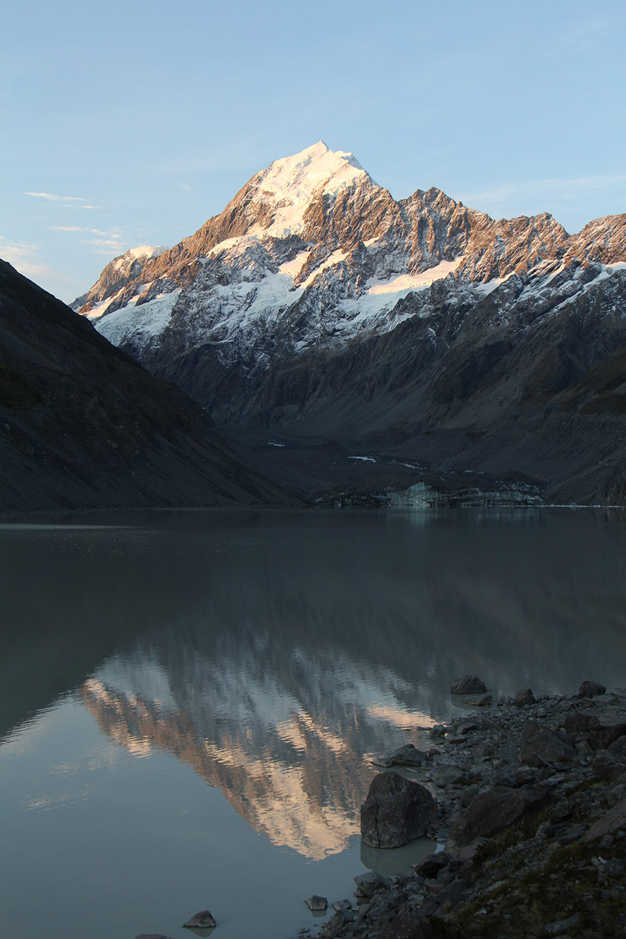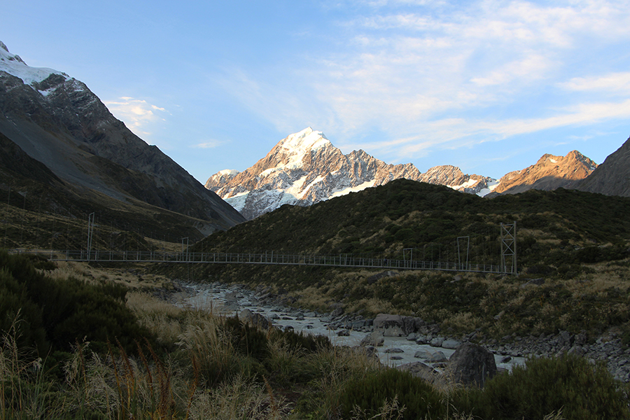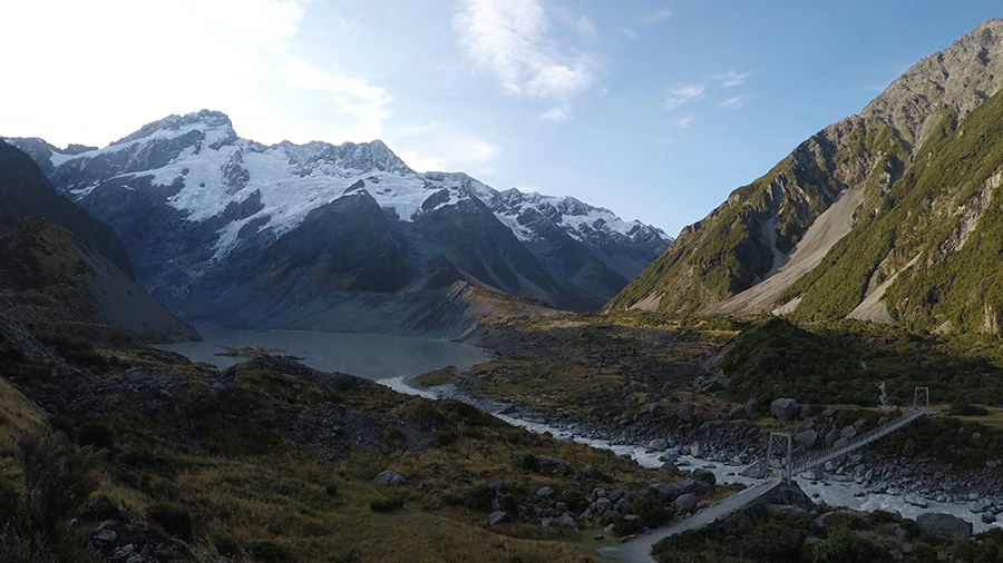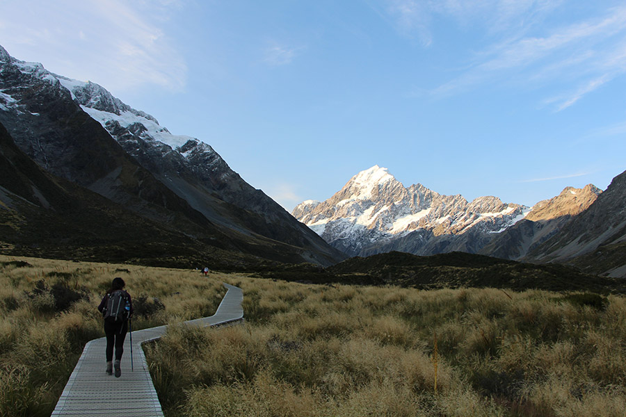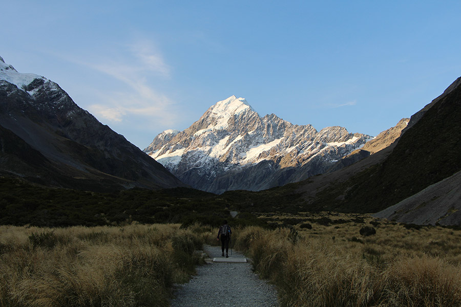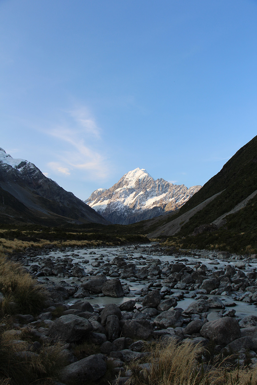 Nous nous rejoignons ensuite au van pour manger. Nous passons l'après-midi à nous reposer et nous avons la visite de Yolaine & Jules qui ont également passé la nuit sur le camp et on fait le mont Olivier ce matin aussi ! C'est un réel plaisir de les revoir, et une bonne occasion de prendre l'apéro ensemble :) Ils repartent ensuite pour Wanaka et nous préparons les sacs car nous souhaitons camper sur la Hooker Valley Track. Il s'agit de la randonnée la plus populaire de la région et dans la journée c'est vraiment DisneyLand avec les cars de touristes qui arrivent en masse...donc nous espérons qu'au crépuscule, elle sera moins fréquentée ! Et nous n'avions pas tord, il ne reste pas grand monde sur la track et la plupart prennent le chemin du retour. Le chemin est tout plat et mène au plus près du mont Cook et il faut bien se l'avouer c'est splendide, les lumières du crépuscule ajoute un charme particulier magnifique !