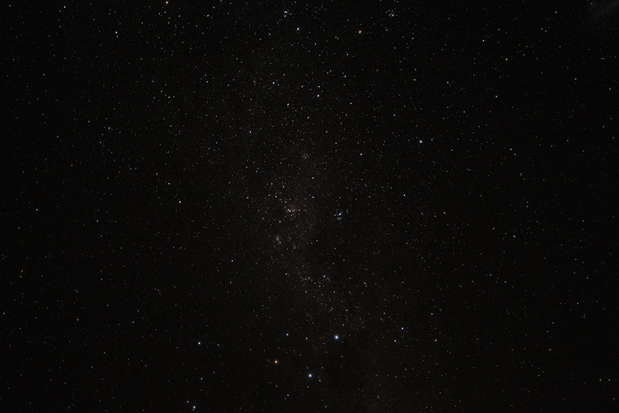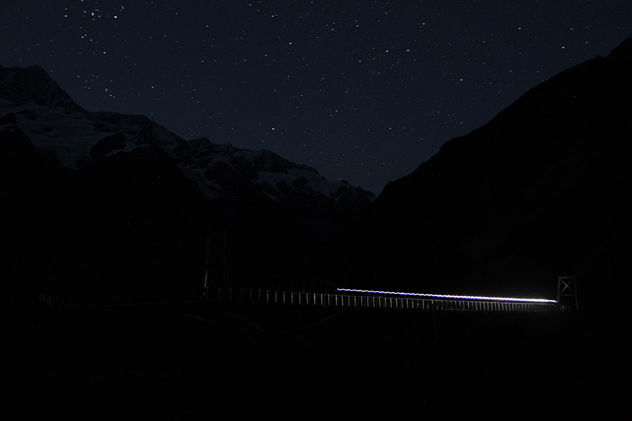 Nous arrivons au lac le long duquel nous comptions dormir. Il n'est pas possible de dormir sur le chemin qui mène au lac mais seulement après ce chemin, il y a normalement un autre sentier qui monte à un col. Malheureusement, nous tombons de haut lorsque nous trouvons le chemin en question qui n'en est pas vraiment un en fait...nous nous disons que personne ne doit jamais l'emprunter car il n'y a vite plus de chemin et nous devons nous frayer un chemin à travers le maquis néo zélandais, ce qui devient vite ardu...la nuit commence à tomber et le premier terrain plat pour camper semble encore bien loin derrière un passage d'éboulis à franchir donc nous préférons rebrousser chemin et retourner dormir dans notre van sur l'accotement où nous avions dormi hier. Nous sommes récompensé par des superbes étoiles !