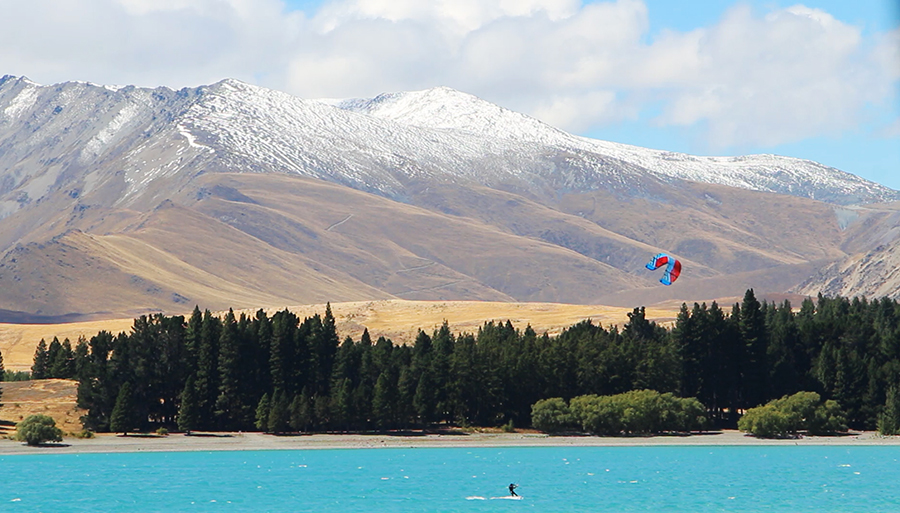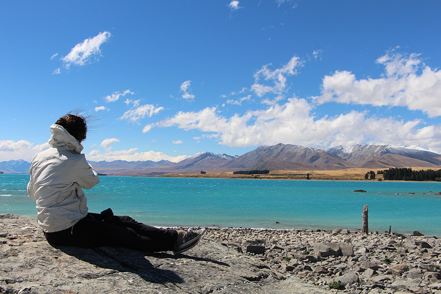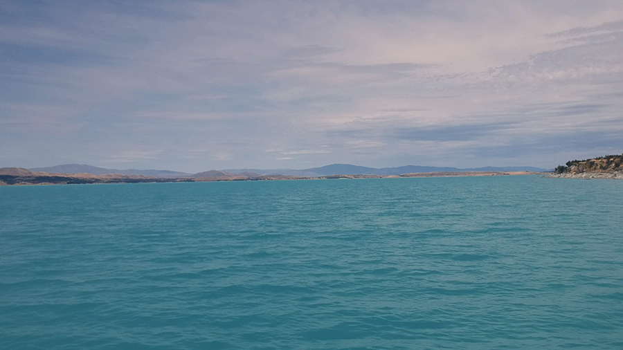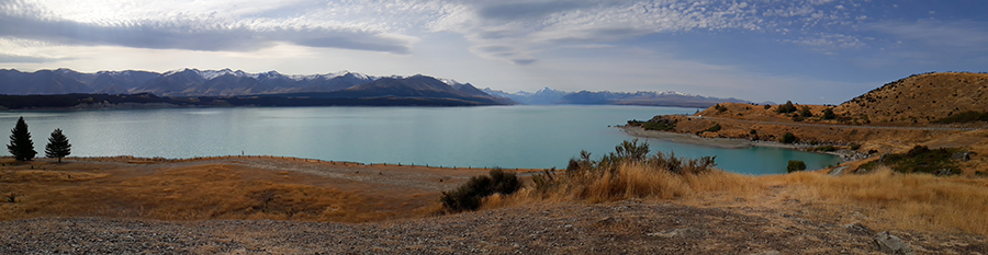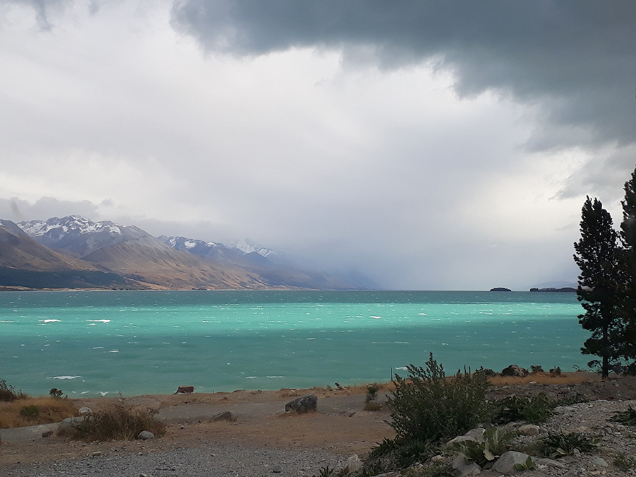 Aujourd'hui, le temps annoncé était couvert et pluvieux mais finalement c'est plutôt nuageux avec beaucoup de vent. Le soleil entre les nuages donne des couleurs surprenantes sur le lac Pukaki.