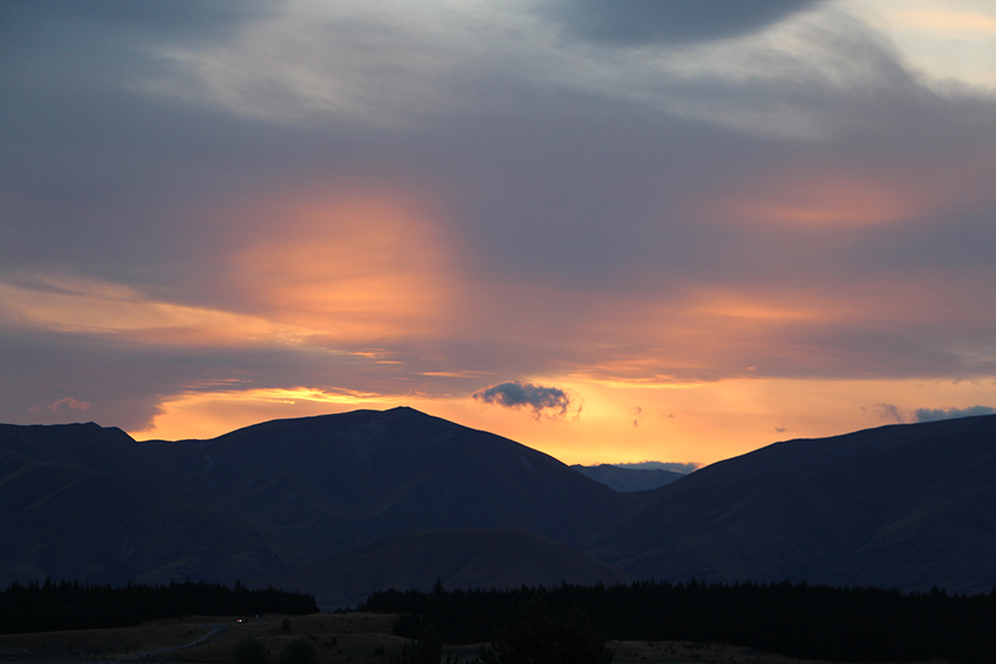 Nous prenons ensuite la route de Twizel où nous faisons quelques courses et prenons une douche. Nous allons enfin dormir sur un freecamp sur les abords du lac Pukaki, le coucher de soleil est superbe.