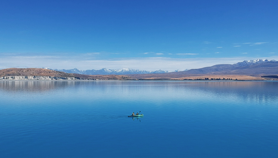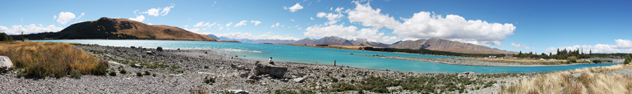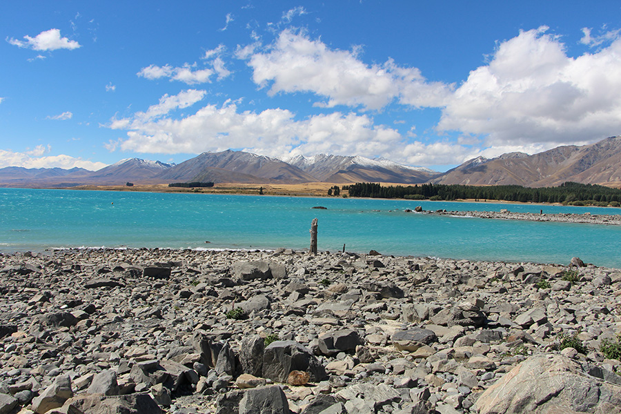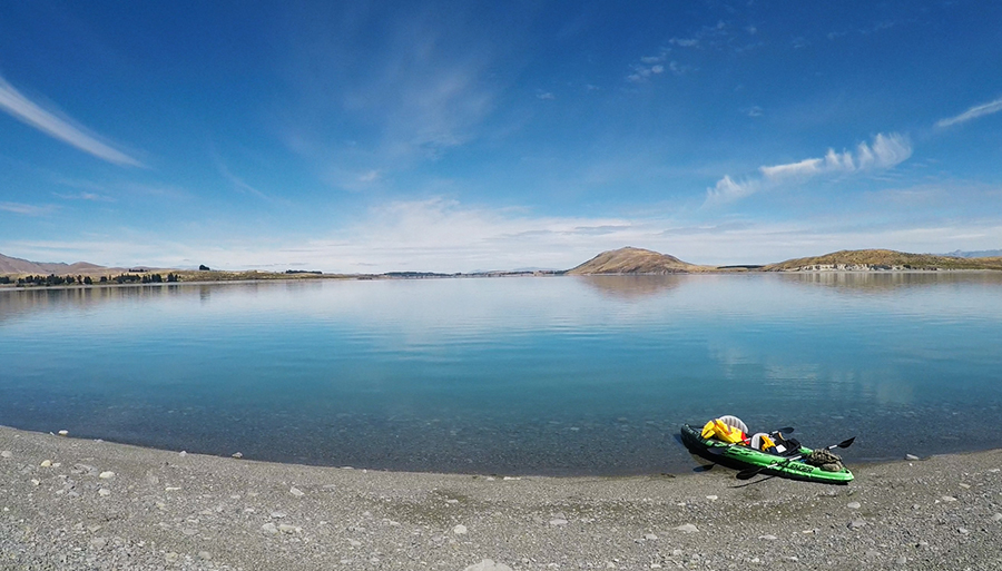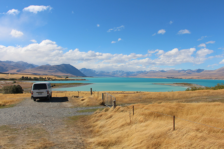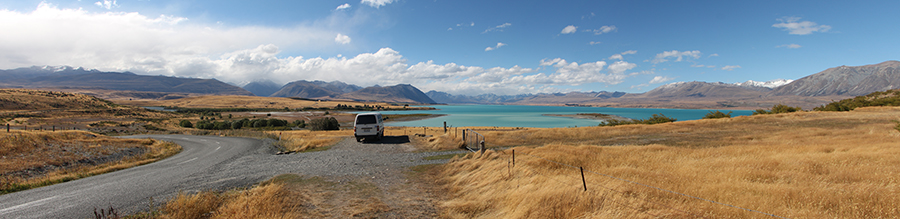 Nous avions prévu de filer à Timaru sur la côte est aujourd'hui pour entamer notre remonter vers le nord. Mais c'est tellement beau que nous décidons de rester une nuit pour tenter de faire du canoë sur le lac demain car le temps est annoncé plus clément. Nous nous baladons donc autour du lac pour tenter de trouver un accotement pour dormir car nous avons le droit avec notre van. Les abords sont superbes !