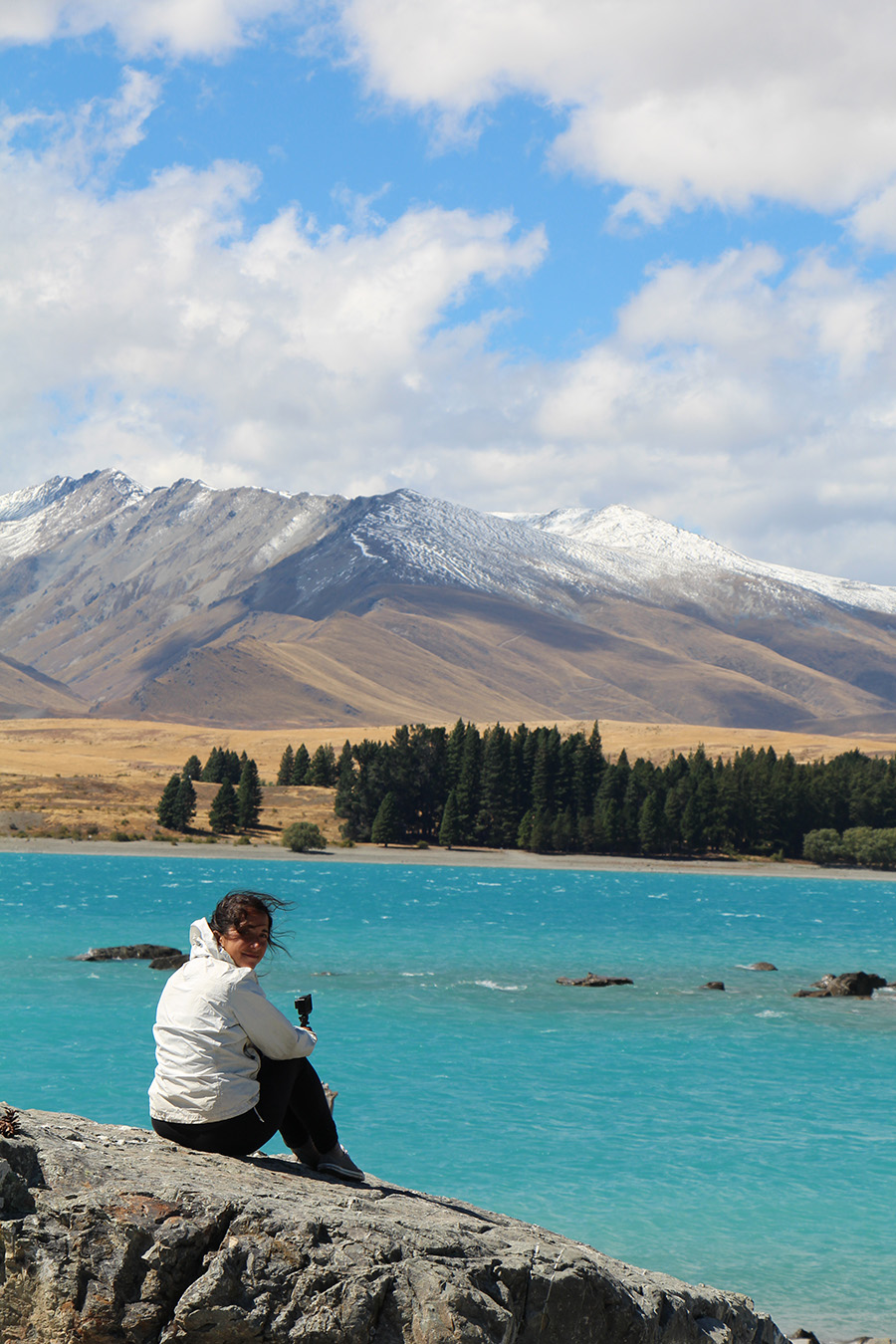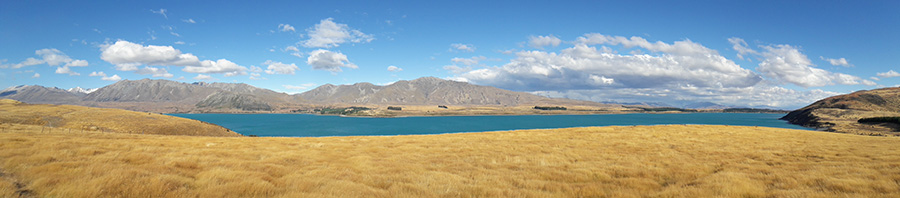 Le temps se gâte avec quelques gouttes, ce qui accélère notre redescente...nous allons ensuite manger le long au bord du lac près du centre ville, le vent est si fort qu'il nous oblige à manger dans le van mais d'un autre côté il dégage les nuages et nous pouvons finalement admirer le bleu si intense du lac. Les couleurs résument à elles seules l'ensemble des paysages de NZ : le jaunes des plaines, le bleu des lacs, le vert des forêts, le gris des roches et le blanc des sommets ! C'est sublime et l'un des plus beaux panoramas de NZ que nous ayons eu la chance de contempler !!