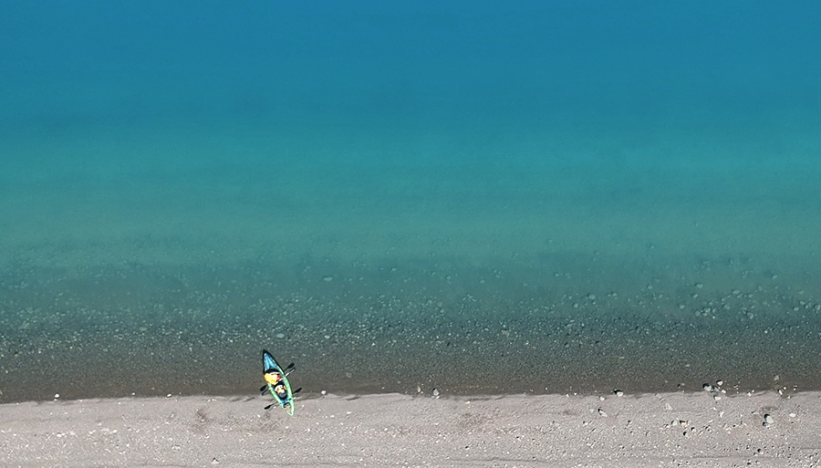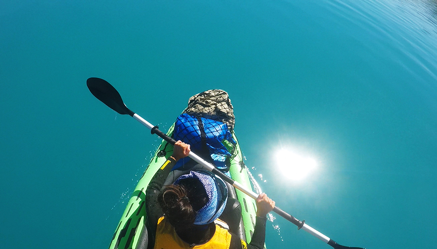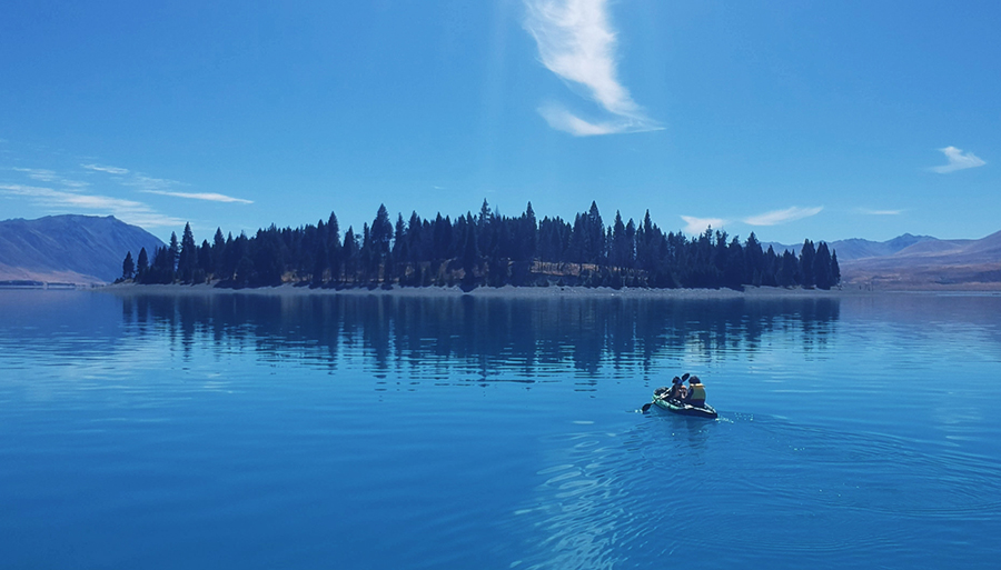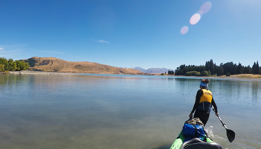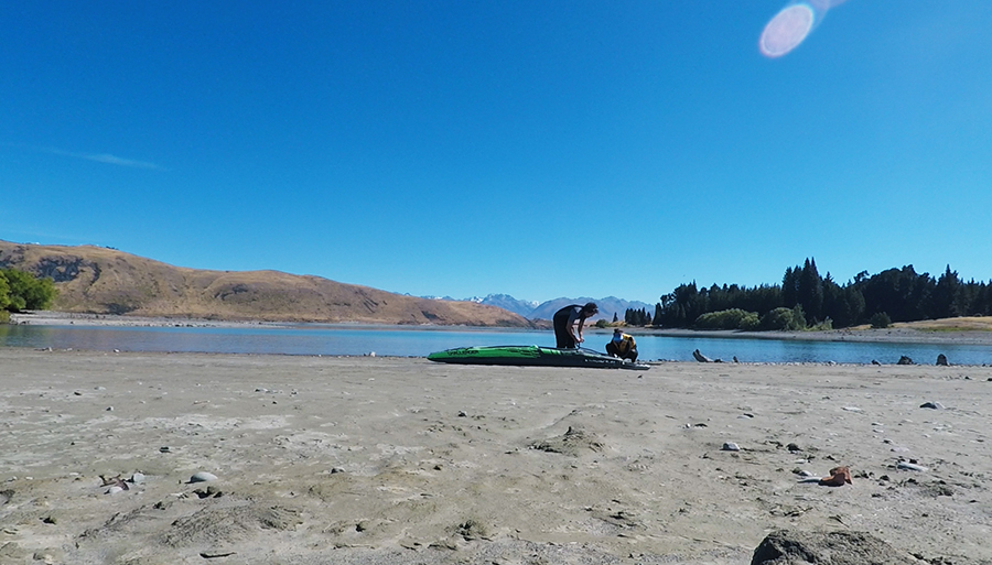Bon par contre, nous avons un petit soucis...nous nous rendons compte arrivés sur l'île que le canoë s'est quelque peu dégonflé. Nous lui redonnons donc un bon coup de gonflage avant de repartir et espérons que cela suffira pour atteindre la berge...il se trouve qu'il se dégonfle à vu d’œil mais heureusement il est constitué de deux chambres à airs séparées ce qui nous permet d'atteindre le rivage. Nous le sortons de l'eau pour voir d'où vient la fuite et constatons qu'il y a en effet un bon trou à une « couture », c'est le prix à payer qu'en on a un canoë pour lequel on a pas mis le prix justement ^^ Rappel le canoë nous à coûter 160 dollars soit environ 90 euros...De plus, nous n'avons pas vraiment fait l'entretien comme il se doit, lavage et séchage après chaque sortie, il faut dire qu'en van c'est un peu compliqué...bref nous sommes au moins arrivés sur le rivage et il reste bien 5 kilomètres à faire jusqu'à la rampe de mise à l'eau où nous avons laissé le van. Nous décidons donc de ne pas tenter l'impossible, nous dégonflons le canoë et ramenons toutes les affaires le long de la route qui longe le lac. Thibault part ensuite en courant (rapidement pris en stop) pour récupérer le van et venir chercher Aurélie ! Même si le canoë a rendu l'âme aujourd'hui, nous l'avons bien rentabilisé à la vue des prix de location en NZ et d'autant plus avec cette dernière sortie !