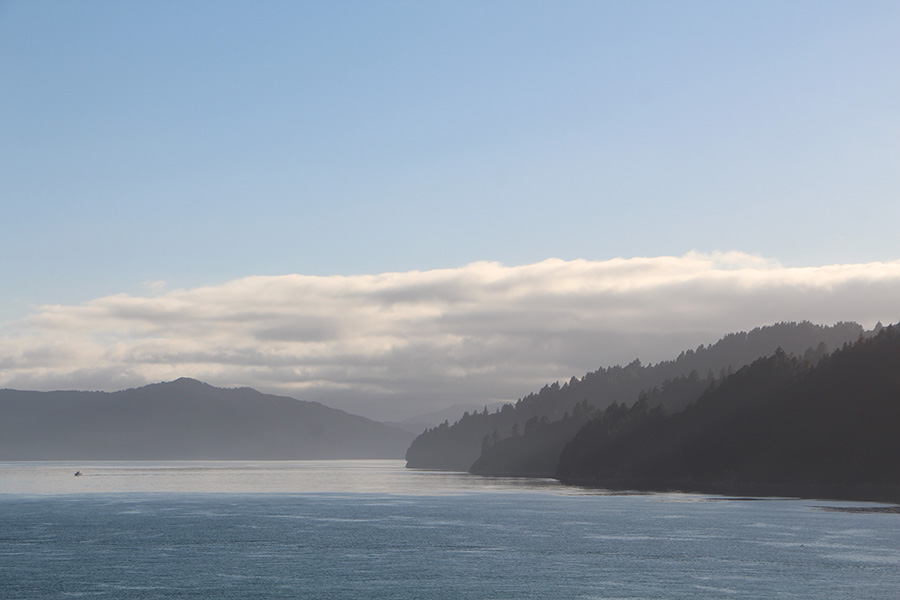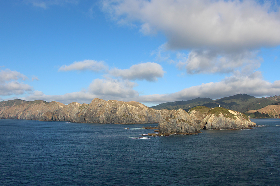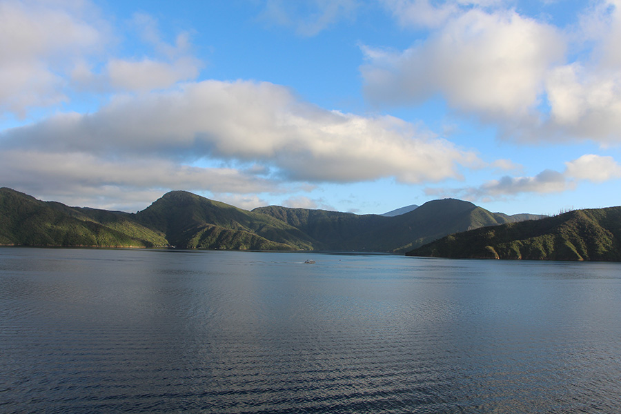 Pour repartir le ferry longe les fjords des Malborough Sounds, on monte donc sur le pont le plus haut pour profiter de la superbe vue ! Quand soudain on aperçoit le jet d'une baleine ! On essaye de la prendre en photo mais ça ne rend pas grand chose avec notre appareil ;)