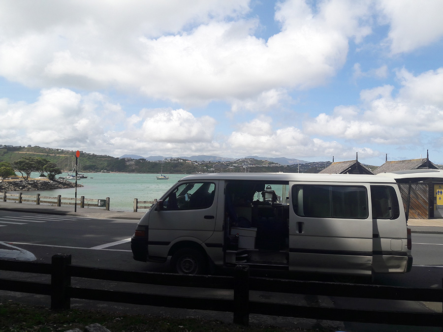 Aujourd'hui, réveil matinal pour une petite séance de sport sur le terrain de criquet à côté du freecamp. Le vent souffle bien fort comme tous les jours à Wellington ! Nous passons ensuite à Evans Bay pour prendre une douche certes froide mais gratuite :) Nous mangeons à côté des douches sur une table de pique nique qui borde la baie.