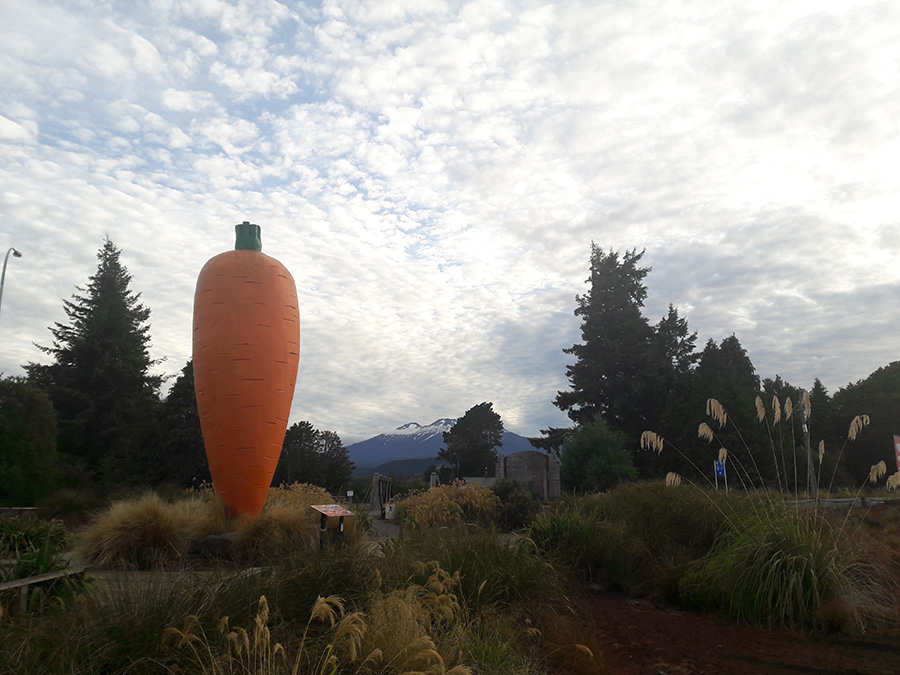 Nous vérifions la météo et voyons que demain il fait beau mais qu'après ça va se gâter pour le reste de la semaine...nous décidons donc de foncer vers National Park pour aller faire la grande randonnée du Tongariro Alpine Crossing demain ! Nous repassons par Whanganui pour prendre une douche le long de l'océan où il y a des douches froides gratuites pour les surfeurs. Nous filons ensuite dormir sur un freecamp à Ohakune, à côté d'une carotte géante :)
