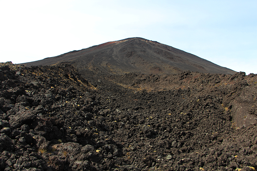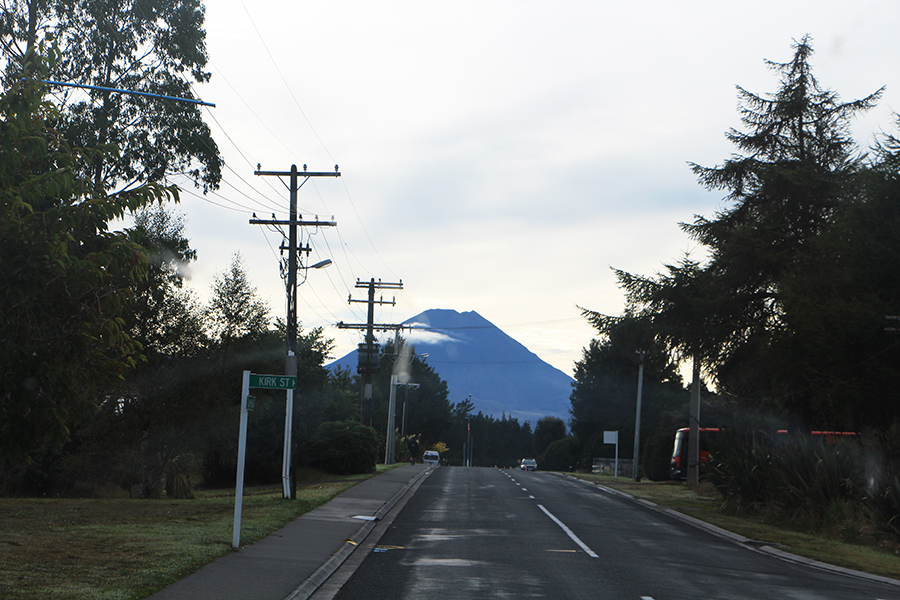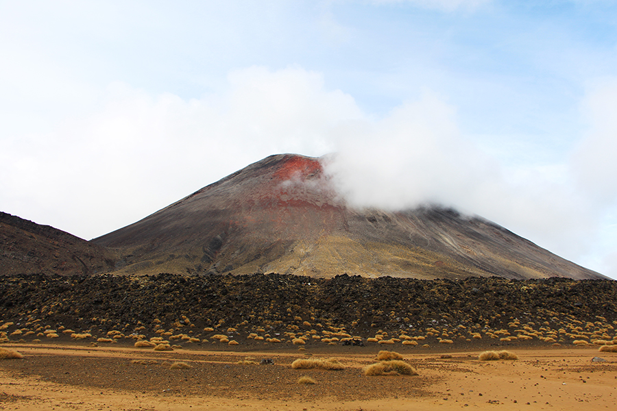 Aujourd'hui, nous avons réservé la navette pour faire la grande randonnée du Tongariro Alpine Crossing qui consiste en une traversée sur le flanc de volcans. Comme nous l'avons souvent évoqué, les randonnées en NZ sont très, voir trop aseptisées et on est souvent loin de la randonnée du type : « je prends mon sac le premier chemin venu qui part dans la montagne et on me revoit dans 3 jours ! ». Cette grande randonnée ne déroge donc pas à la règle...le parking au départ et à l'arrivée de la rando est limité à 4h pour une randonnée de 19km et environ 1000 mètres de dénivelé...de plus ce n'est pas une boucle (oui niveau logistique ils n'ont pas compris non plus l'intérêt des randonnées en boucle en NZ). Bref, tout est fait pour prendre une navette, ce qui énerve passablement Thibault ! Donc nous devons prendre une navette qui nous emmène au départ puis une autre viendra nous chercher à l'arrivée pour nous ramener à notre voiture...Nous partons donc avec la navette de 9h et comme annoncé le temps est pas mauvais, c'est pas le grand ciel bleu mais c'est plus qu'acceptable :) Nous voyons le volcan depuis l'arrêt de bus, l'objectif est en vue !