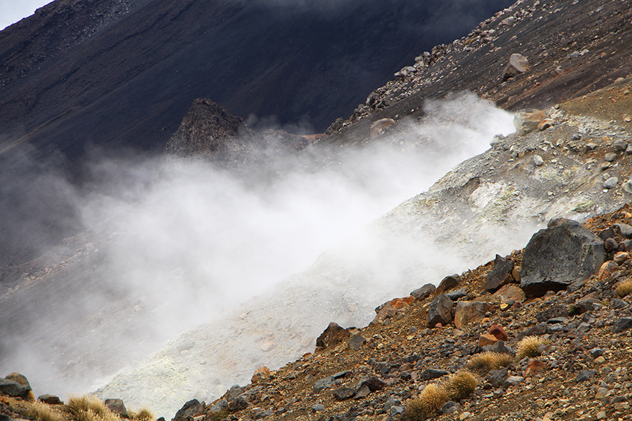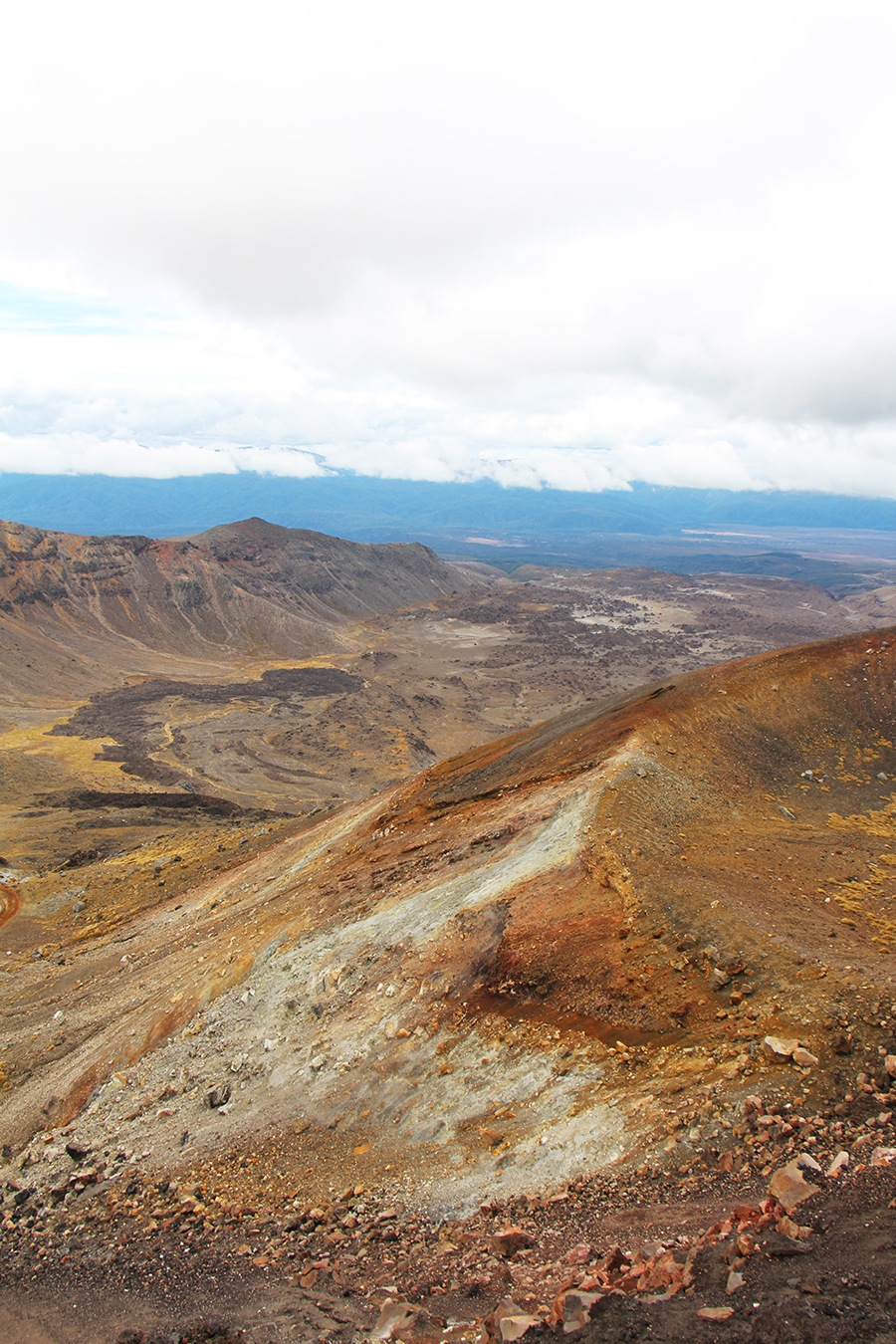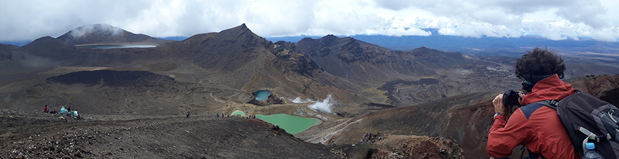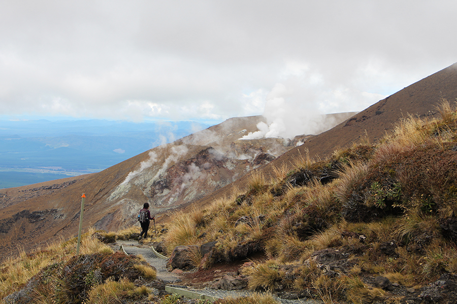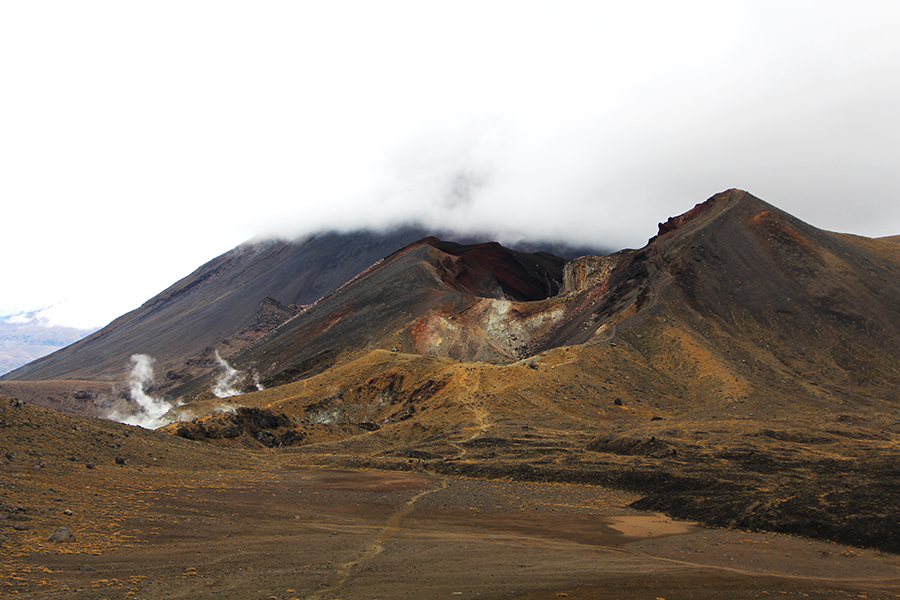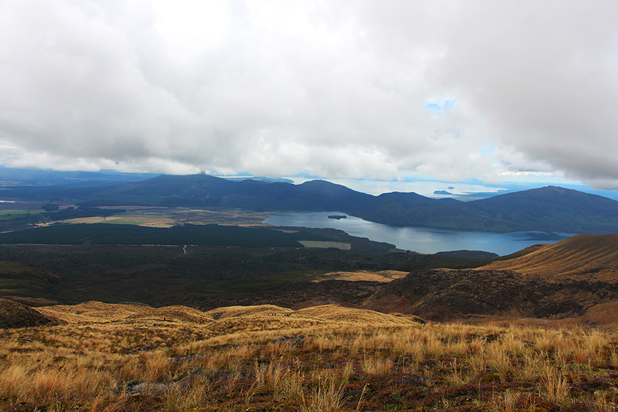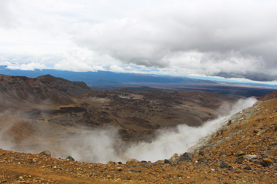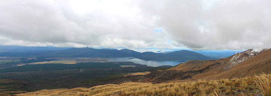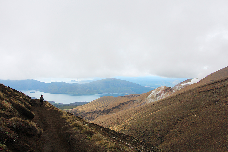 Le chemin passe ensuite par un col et nous passons sur l'autre versant pour descendre vers le parking d'arrivée, la plafond nuageux est bas mais ne nous empêche pas de contempler le lac Taupo au loin ainsi que les fumerolles sur le versant du volcan. On dirait vraiment que la terre respire, c'est fou !