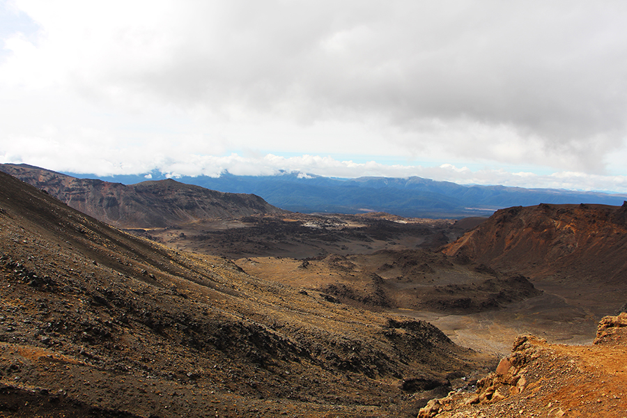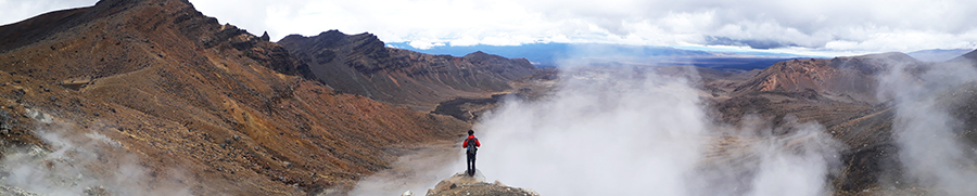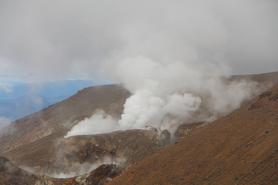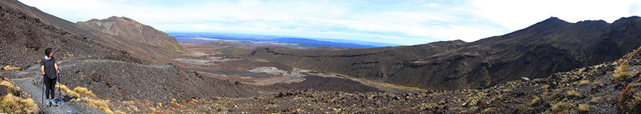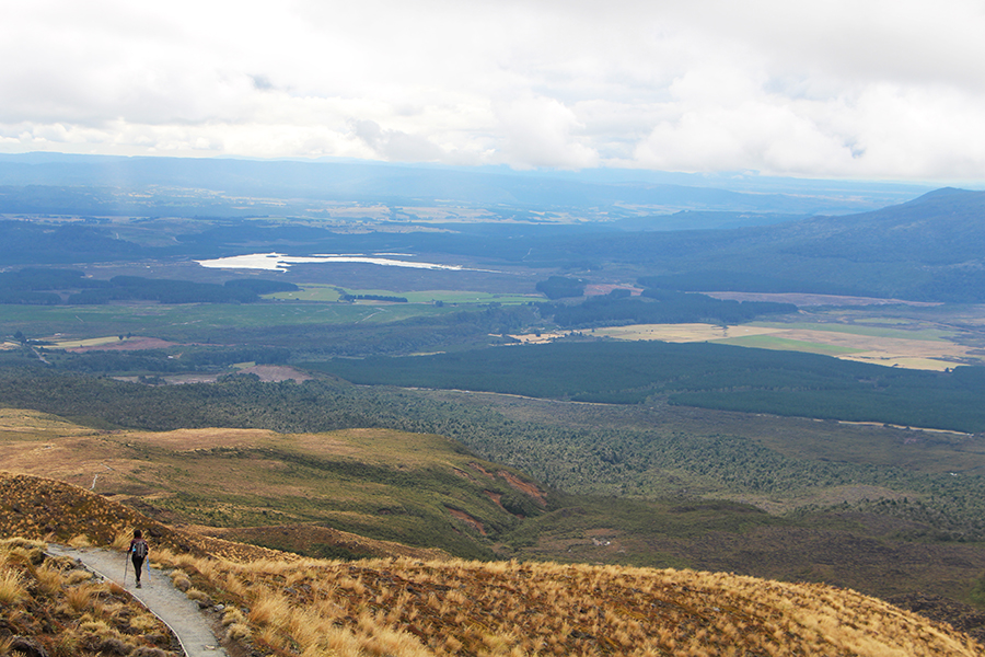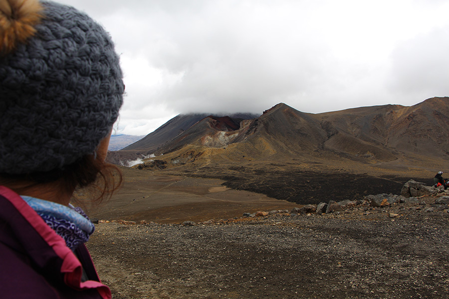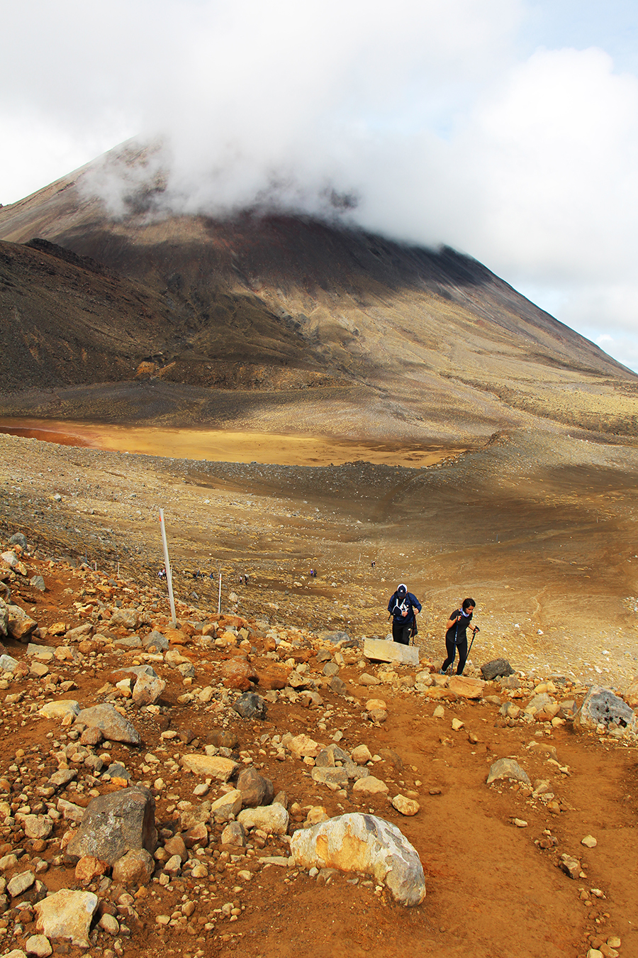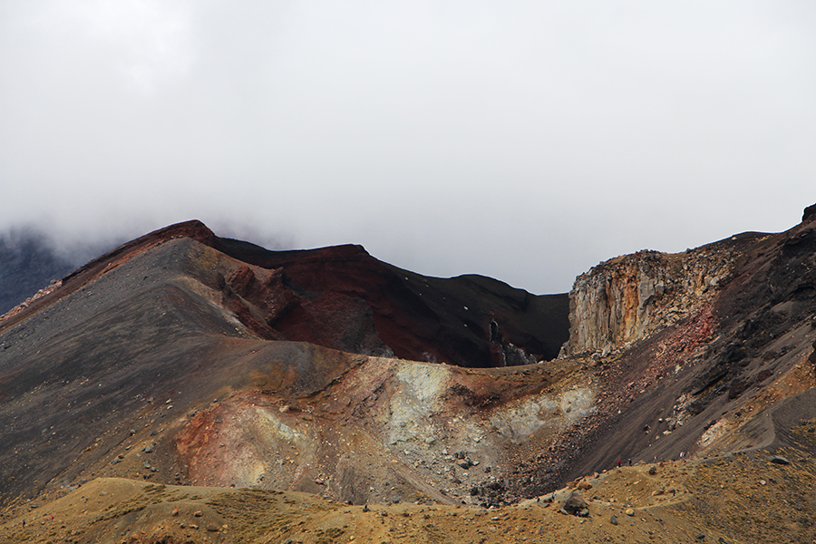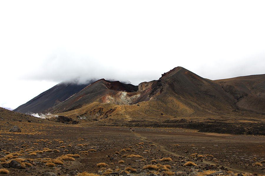 Le chemin passe ensuite par un col et nous passons sur l'autre versant pour descendre vers le parking d'arrivée, la plafond nuageux est bas mais ne nous empêche pas de contempler le lac Taupo au loin ainsi que les fumerolles sur le versant du volcan. On dirait vraiment que la terre respire, c'est fou !