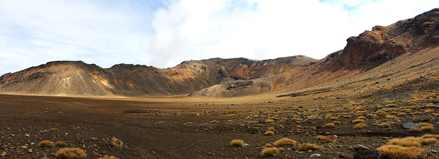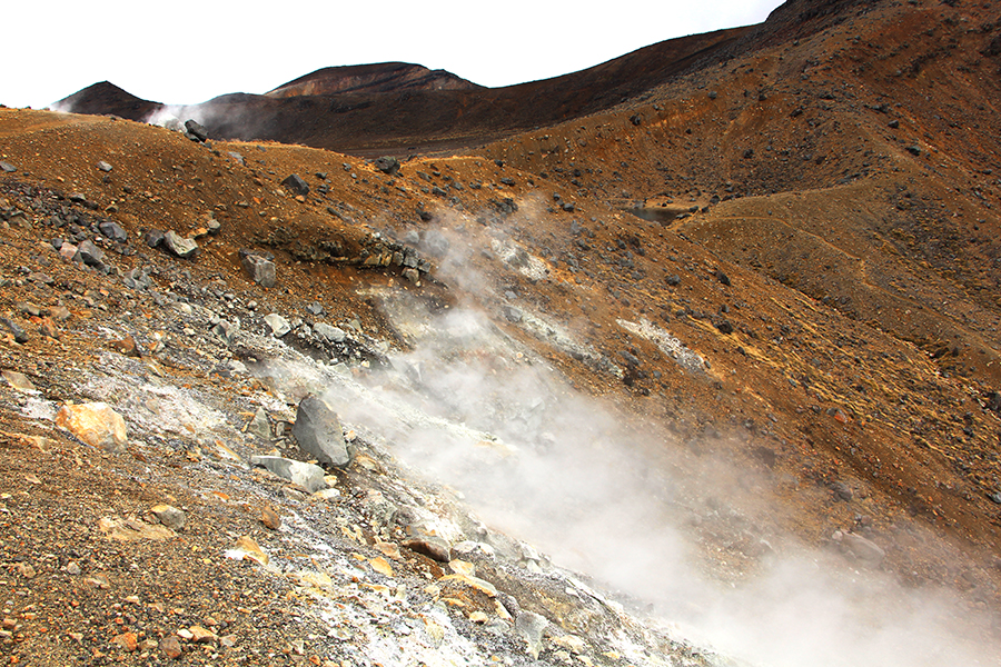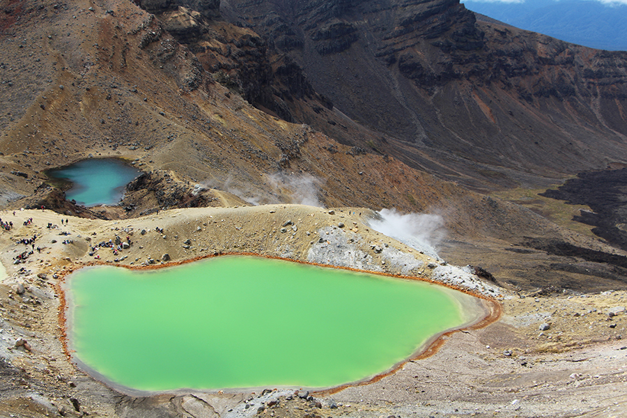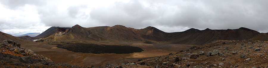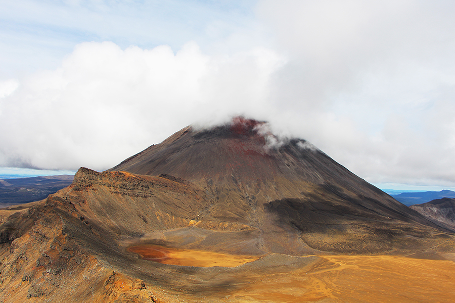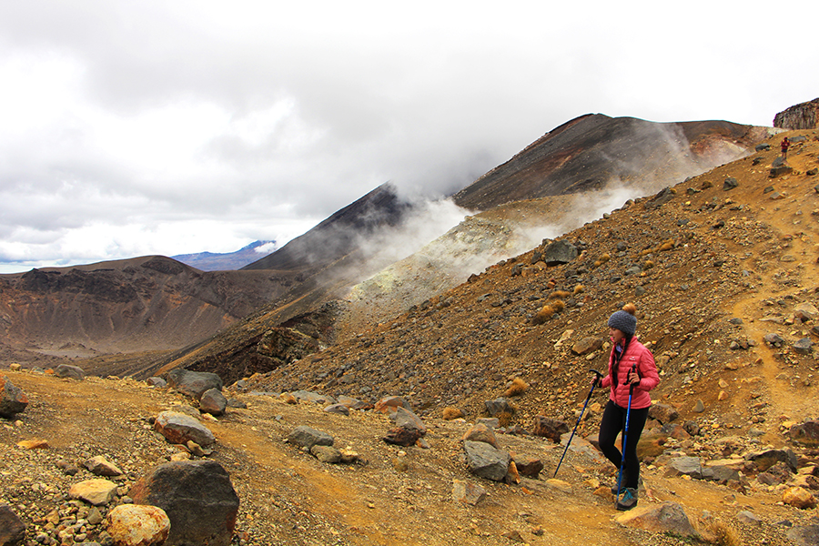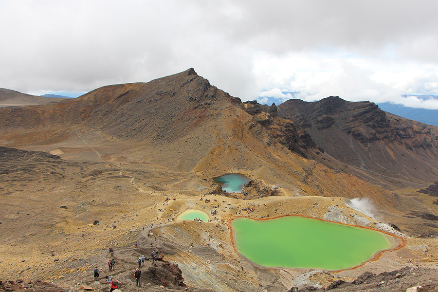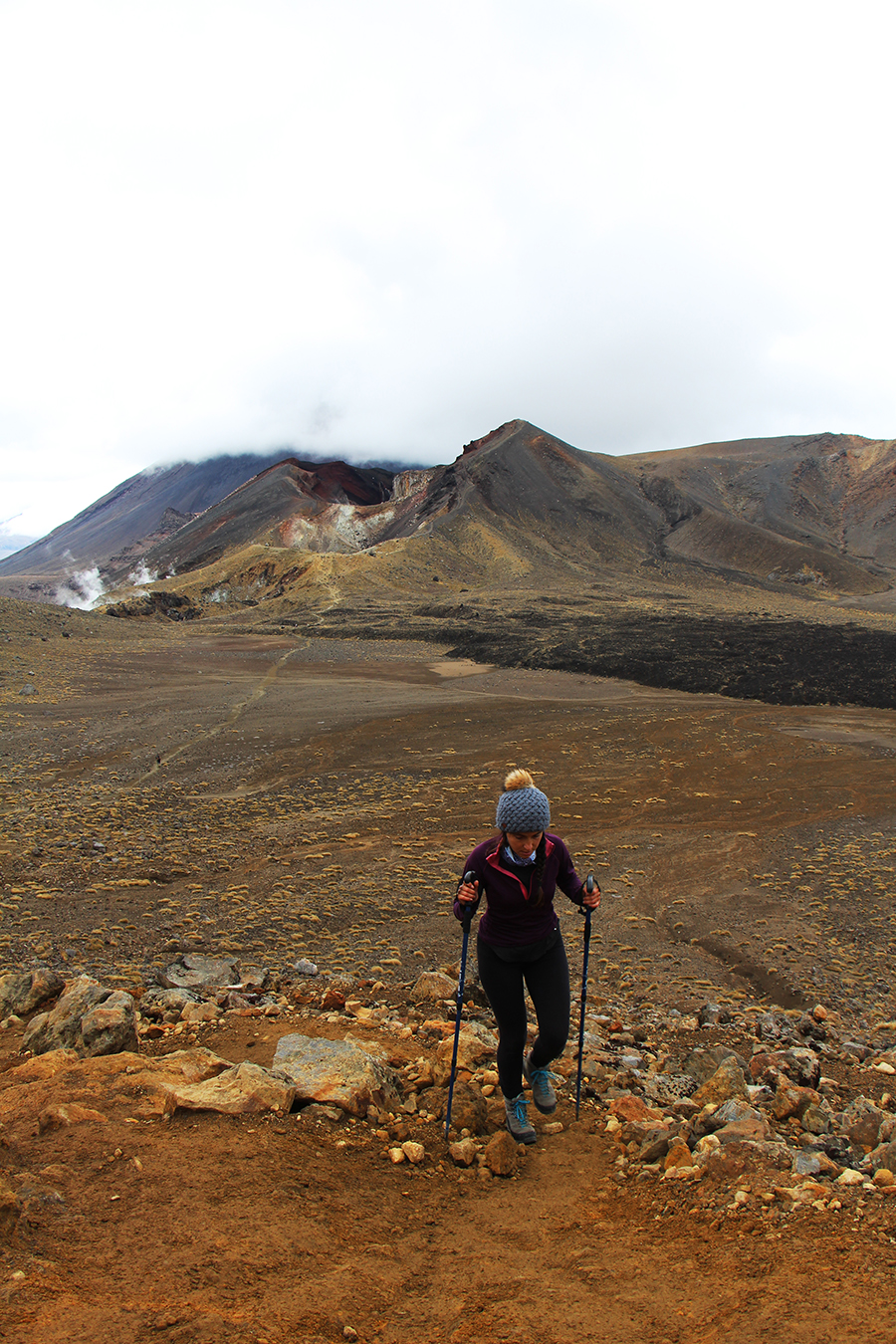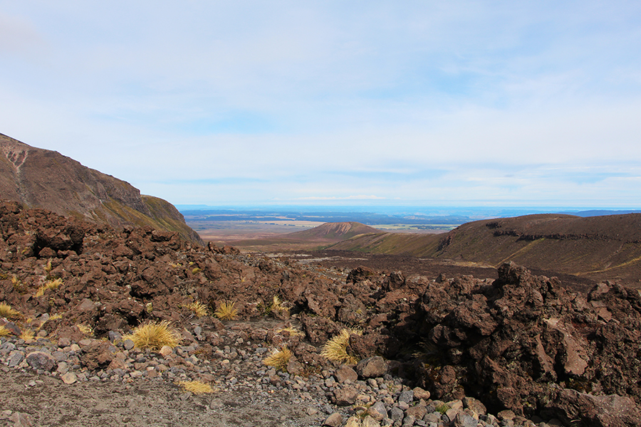 Le chemin passe ensuite par un col et nous passons sur l'autre versant pour descendre vers le parking d'arrivée, la plafond nuageux est bas mais ne nous empêche pas de contempler le lac Taupo au loin ainsi que les fumerolles sur le versant du volcan. On dirait vraiment que la terre respire, c'est fou !