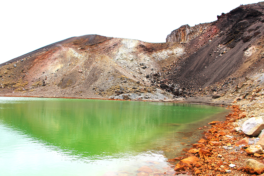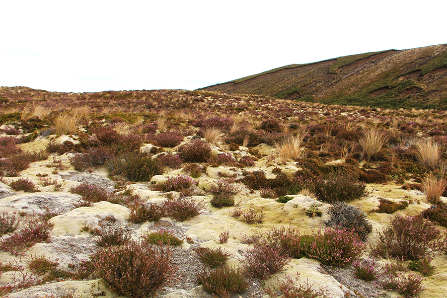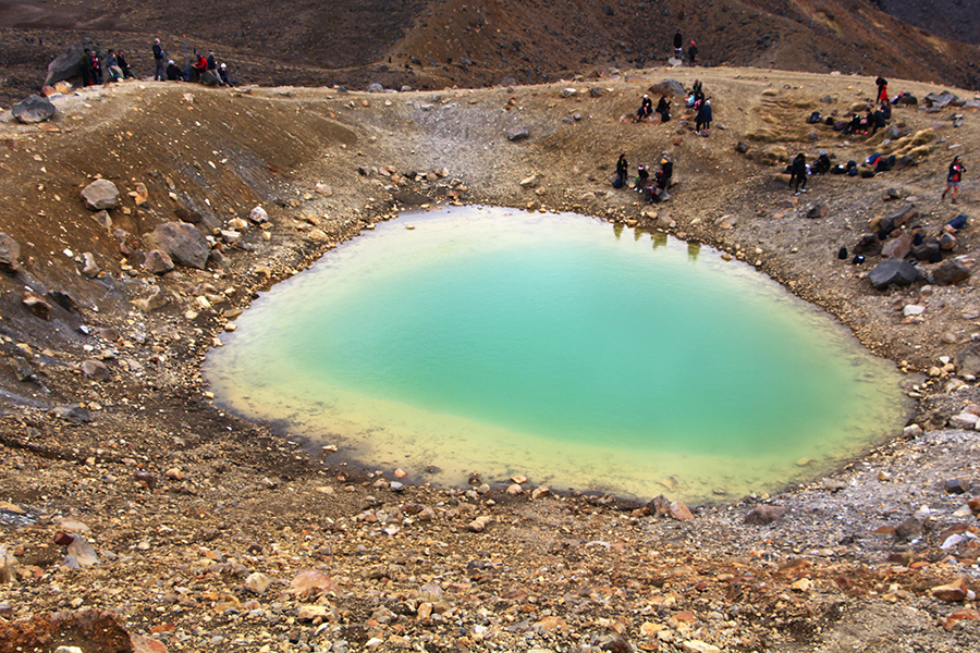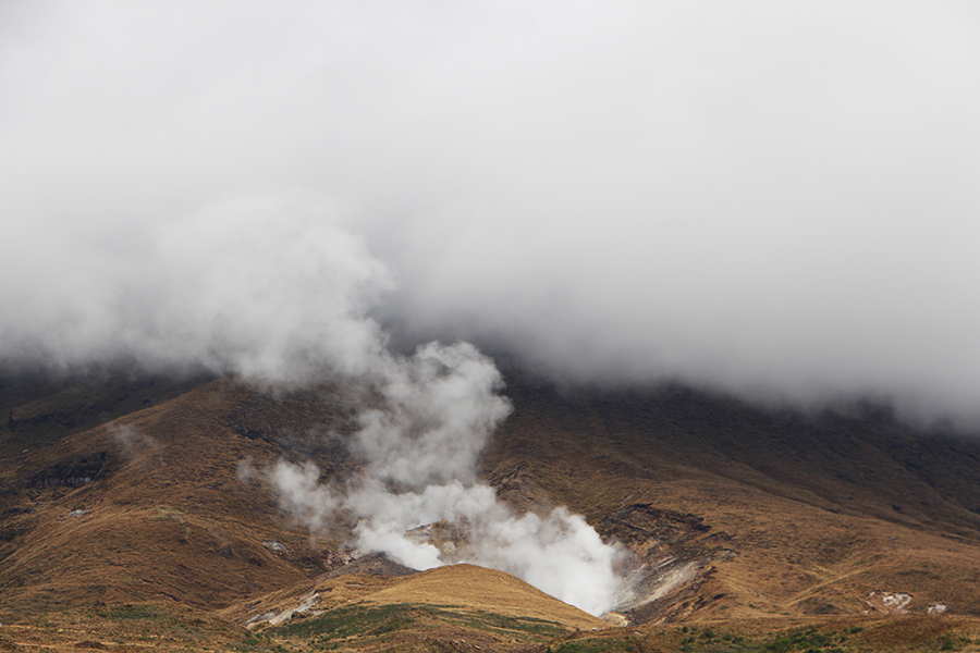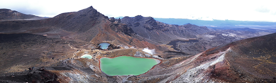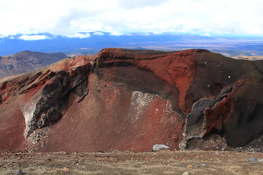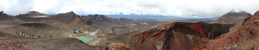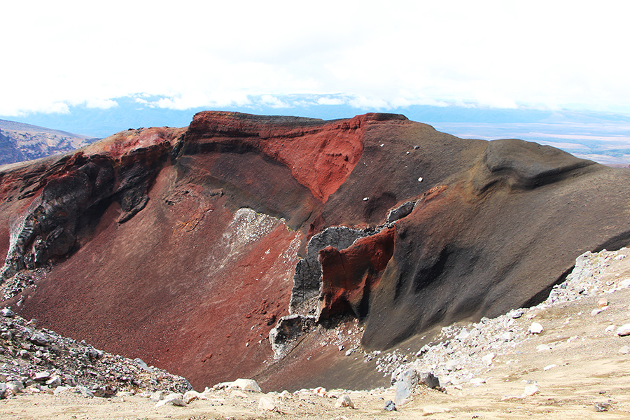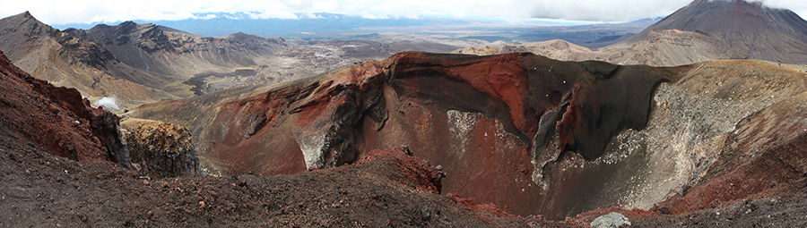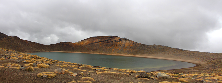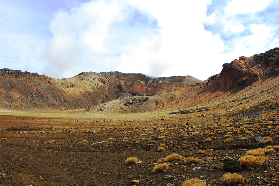 Le chemin passe ensuite par un col et nous passons sur l'autre versant pour descendre vers le parking d'arrivée, la plafond nuageux est bas mais ne nous empêche pas de contempler le lac Taupo au loin ainsi que les fumerolles sur le versant du volcan. On dirait vraiment que la terre respire, c'est fou !