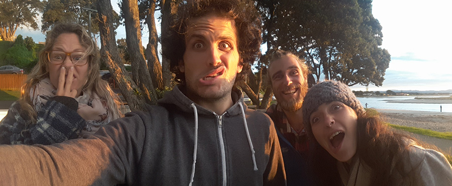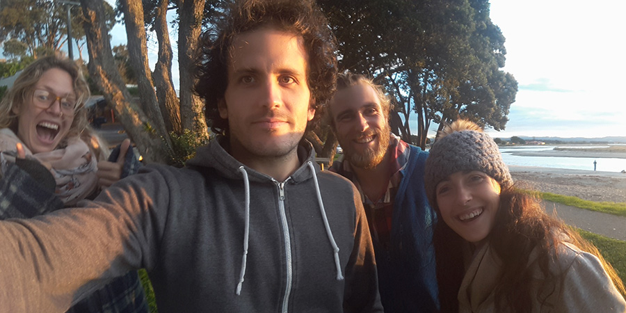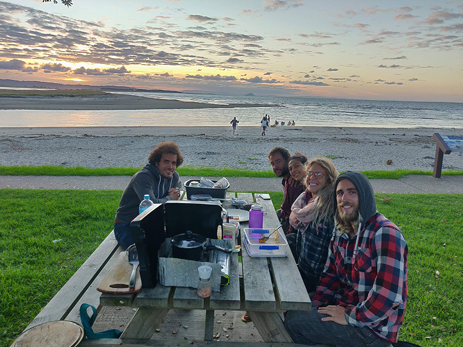 Thibault passe par tous les postes de l'usine de conditionnement : tray preparing (préparation des boites), packing (emballage des kiwis), stacking (empilage de boites, le plus fun mais le plus physique). Le travail dans les kiwis est très dépendant de la météo car quand il pleut, il n'y a pas de cueillette et donc le jour suivant il n'y a pas de kiwis à emballer...donc pour rentabiliser au mieux ces deux semaines de travail, durant les jours off, Thibault va faire la cueillette des kiwis sous contrat avec une autre entreprise. Et oui ici on trouve vraiment du travail facilement :) De plus, Yolaine et Jules, les amis Québécois rencontrés dans les cerises rejoignent Thibault dès la deuxième semaine, aussi bien à l'usine qu'à la cueillette. Cela fait une bonne équipe car Thibault fait aussi la connaissance d'autres français à l'usine : Corentin, Léa et Simon. Le rythme des douches repas au bord de l'océan puis des nuits au domaine est prit ! Thibault prend quand même deux jours off pour rentrer voir Aurélie et la famille Gillum :)