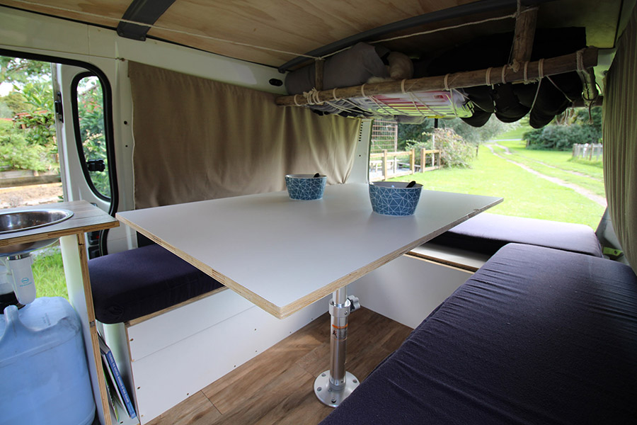 - U-shape bench seat with table in the middle convertible in bed
