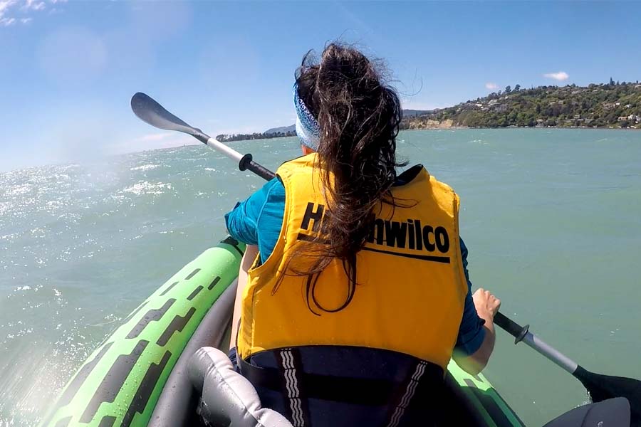 Le temps étant plus clément aujourd'hui, nous voilà partis en direction de la plage Tahunanui (prisée des locaux) afin de tester notre canoë ! Arrivés à la plage, il y a pas mal de vent et de vagues, l'essai est tout de même concluant malgré le vent qui nous fait écourter notre sortie car nous sommes frigorifiés !