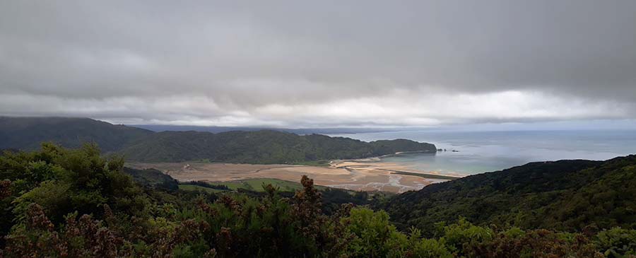 Nous prenons la route en direction du parc National d'Abel Tasman, du nom du hollandais Abel Janszoon Tasman qui fut le premier navigateur à découvrir la Nouvelle Zélande (et la Tasmanie soit dit en passant) en 1642. A vol d'oiseau ce n'est pas si loin mais il n'y a pas de route qui longe le littoral (ce qui est bien cependant) du coup il faut passer par une petite montagne et redescendre de l'autre côté, la route est bien endommagée avec le feu de travaux le plus long de l'histoire (pour réparer une portion de la route justement) : 12 minutes d'attente ! Nous décidons de faire une halte à mi-chemin au freecamp Hawkes Lookout pour y passer la nuit et aussi couper le trajet en deux. La vue depuis le point de vue est belle malgré les nuages qui couvrent les montagnes alentours.