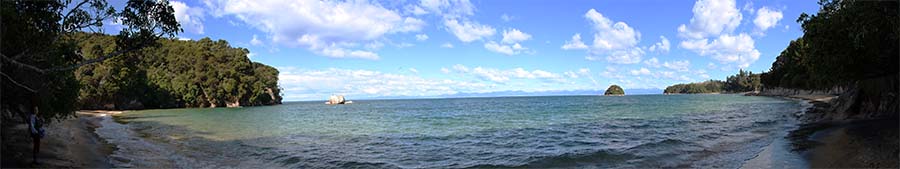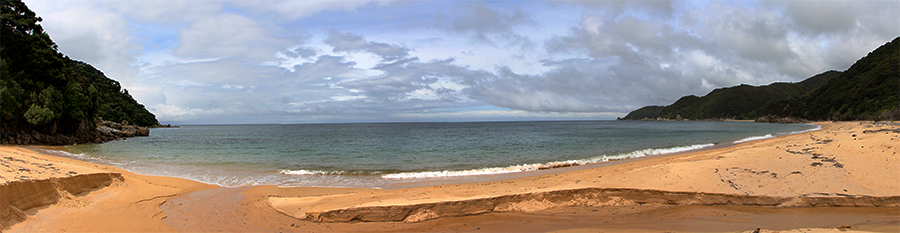 Nous entrons donc sur le sentier de la randonnée qui alterne entre native bush (forêt tropicale), chemin côtier et plage de sable orangé, c'est beau ! Nous passons par Gibbs Hill, Whariwharangi Hut, Separation point et Mouton Cove campsite.