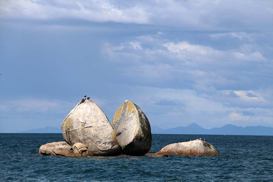 Nous reprenons ensuite la route avec le feu de travaux de 12 minutes, nous n'avons pas le choix, c'est la seule route pour quitter le parc national. Nous nous arrêtons à « Split Apple Rock », rocher atypique et bien connu qui est coupé en deux au beau milieu de l'océan.
