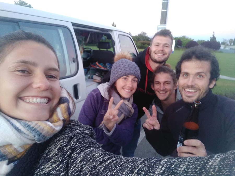 Nous essayons ensuite de trouver une place pour dormir. Nous avons repérer un super freecamp près de la plage mais lorsque nous arrivons celui-ci est déjà complet, et oui nous arrivons vers 19h et savons que c'est un peu tard...nous finissons donc sur un parking en béton près du centre ville et là surprise...à l'instant où on se gare, passe devant nous Baptiste, le woofer qui travaillait chez Hasna quand nous y étions au début de notre voyage (voir épisode 2) ^^ Avec Juliette, sa copine et Antoine, un pote, ils voyagent à trois. Nous passons donc la soirée avec eux sur le parking et avec d'autres backpackers qui dorment sur le camping et qui travaillent dans le coin. La soirée est bien arrosée et c'est vraiment sympa de passer une soirée avec eux !