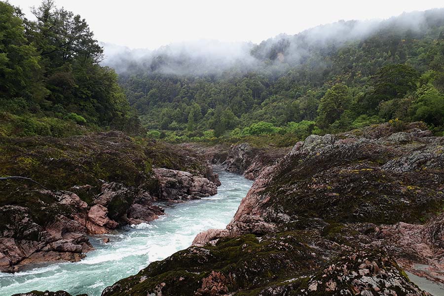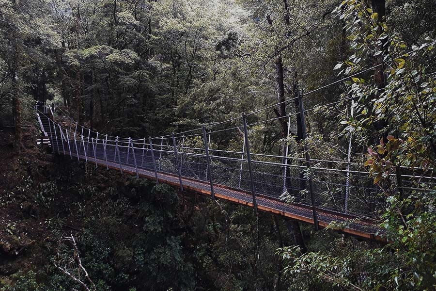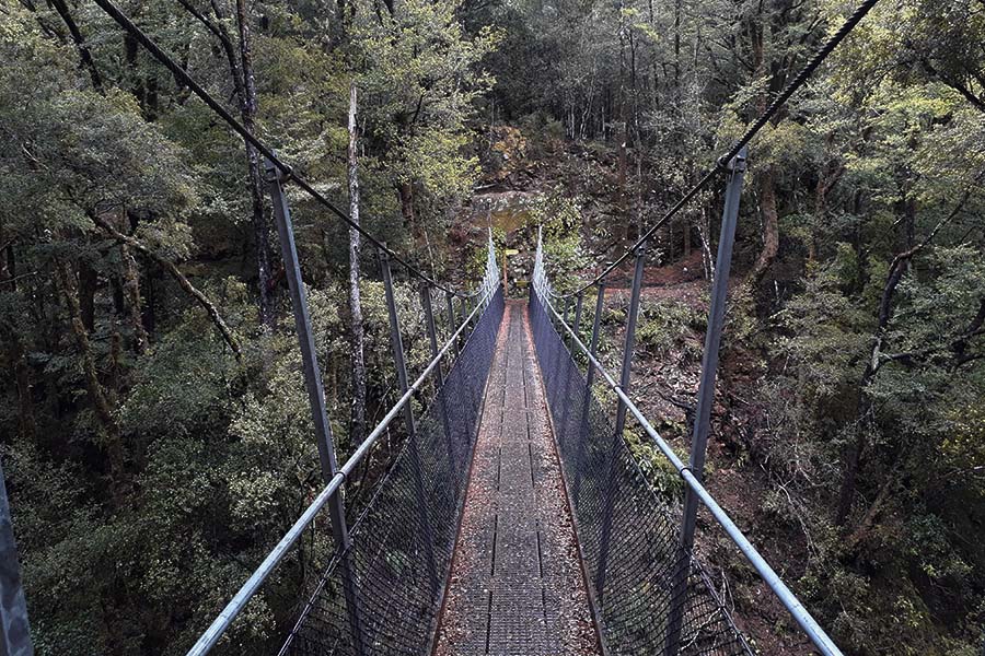 Nous nous arrêtons sur la route aux Ariki Falls puis à la Old Ghost Road qui est un chemin de randonnée à faire en plusieurs jours commençant par une passerelle suspendue au-dessus de la rivière.